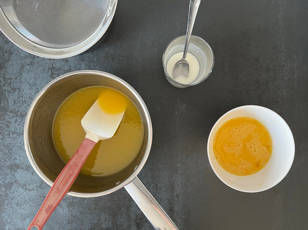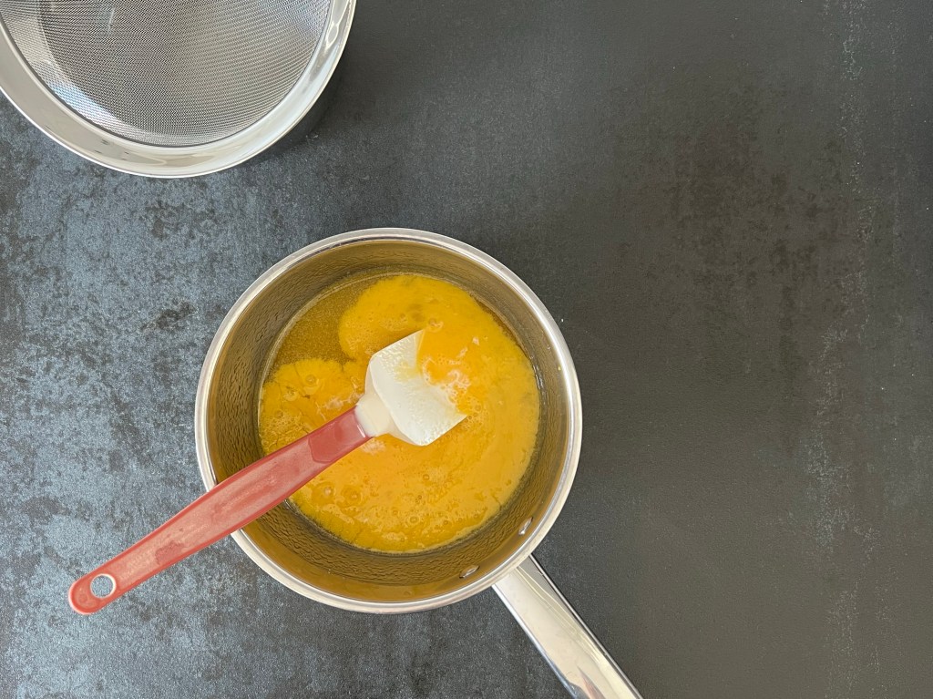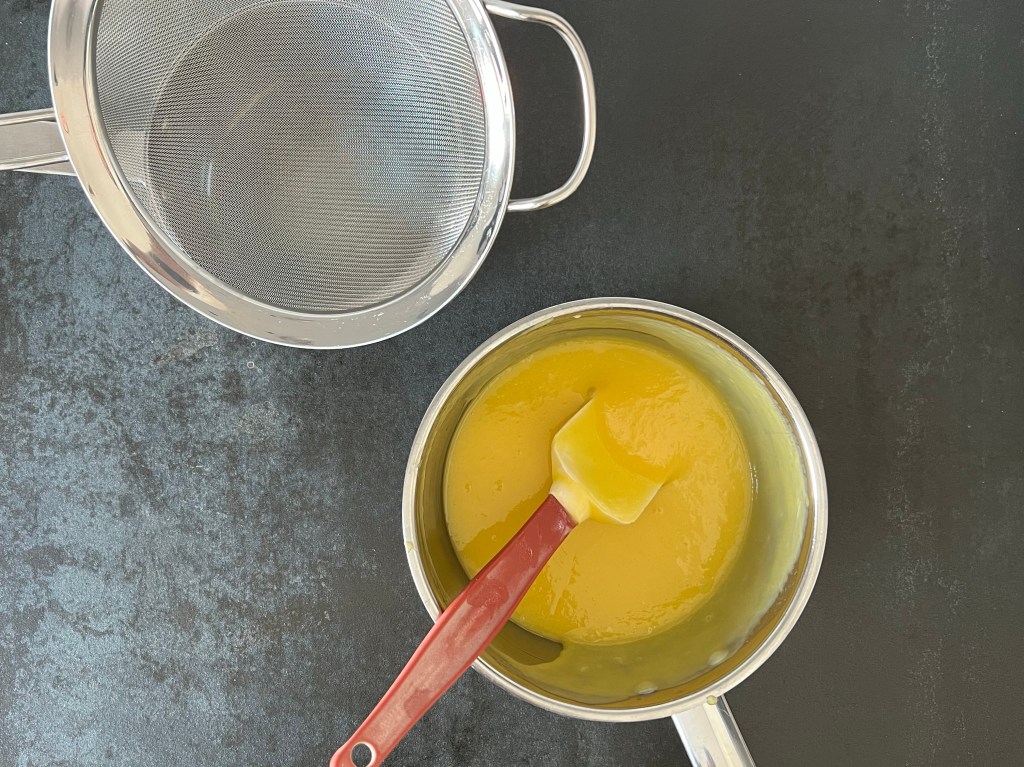 Tillsätter majsstärkelseblandningen och äggen i purékoket och vispar samman. Sätter tillbaka kastrullen på spisen och sänker värmen till strax under hälften. Rör konstant i botten med en slickepott som klarar värme. Rör tills curden tjocknat till en ganska fast och krämig konsistens, utan att bli äggröra. Silar den sedan genom en finmaskig trådsil och sätter in i kylen för att den ska kallna och sätta sig.