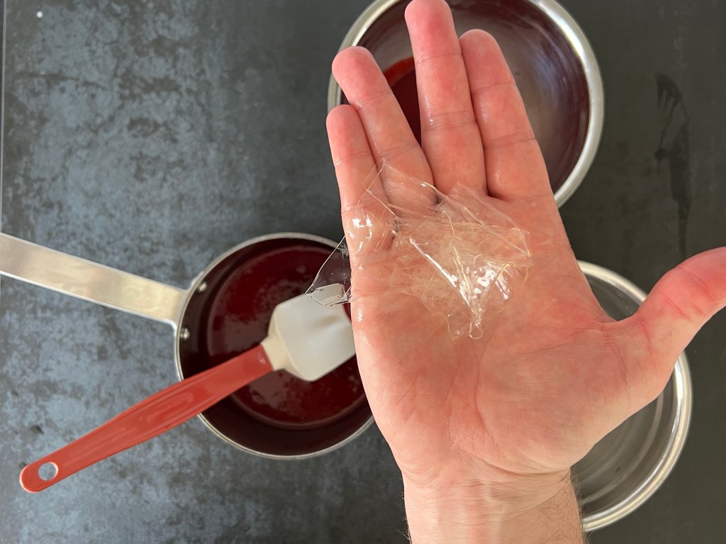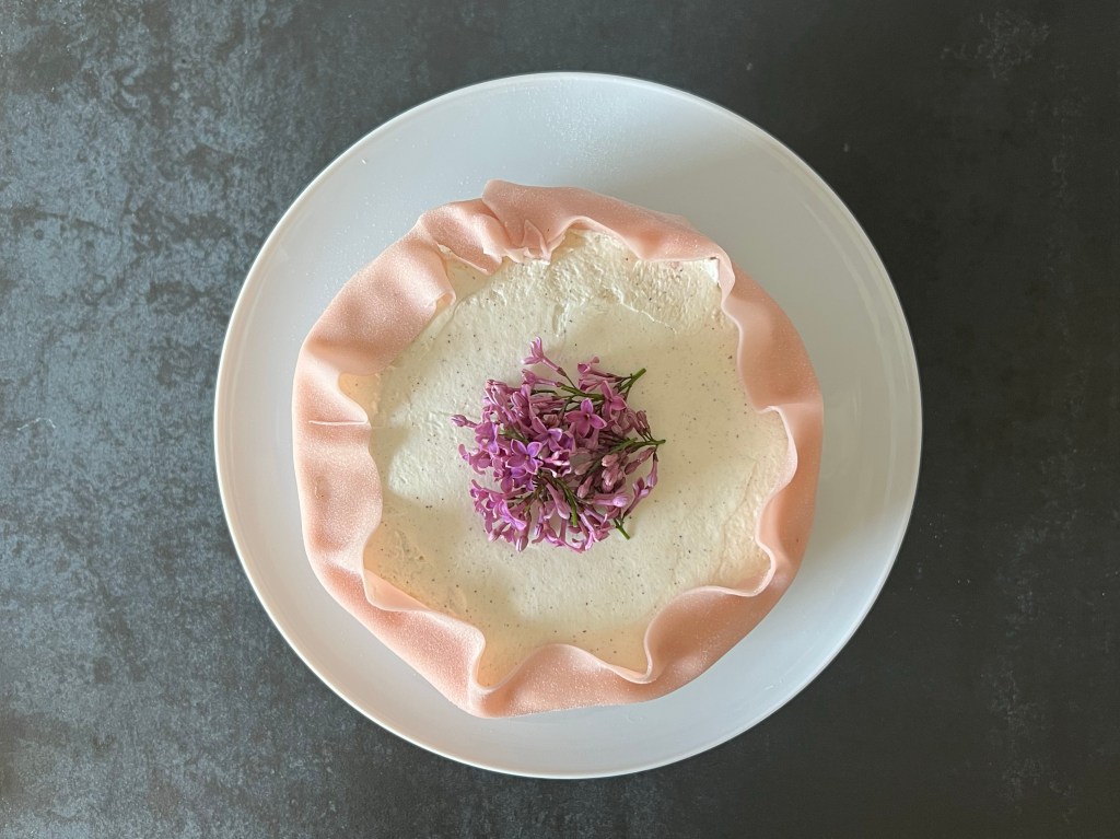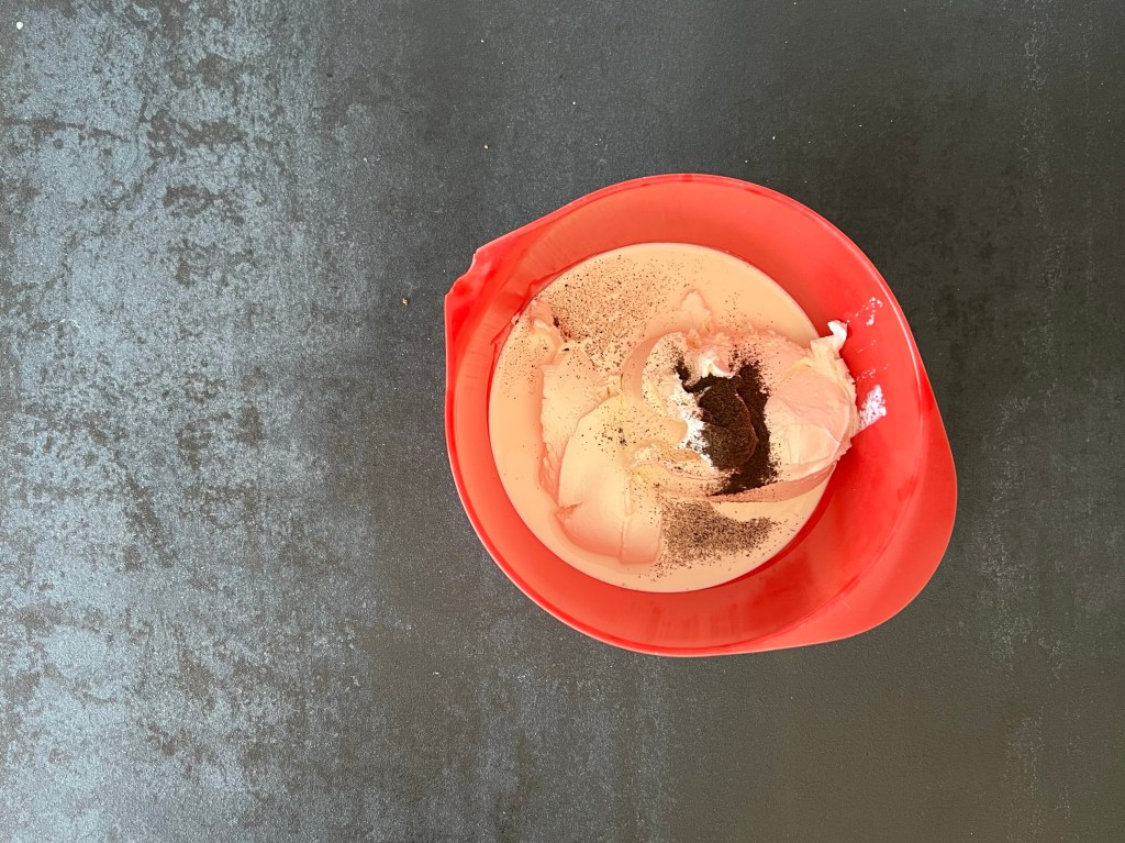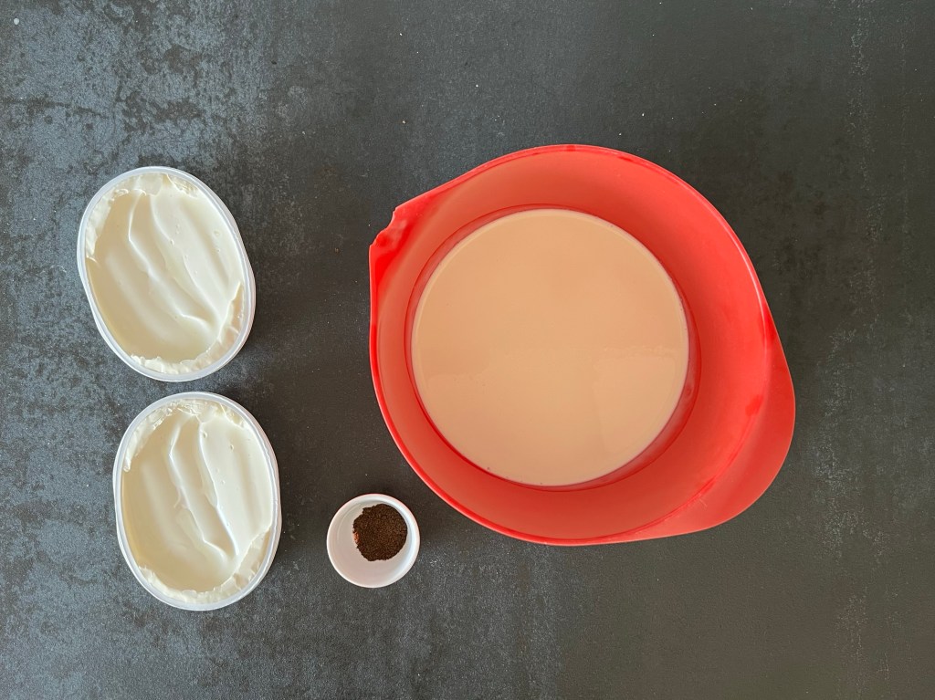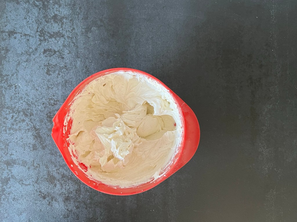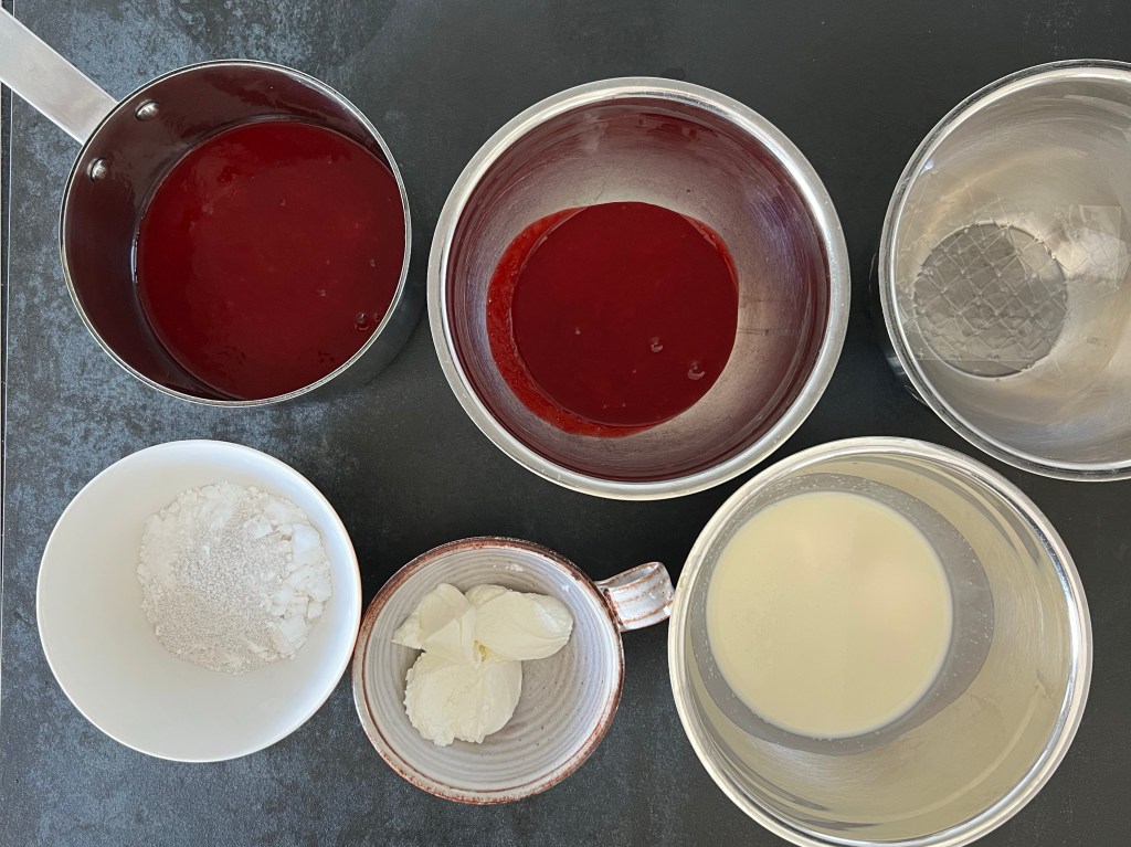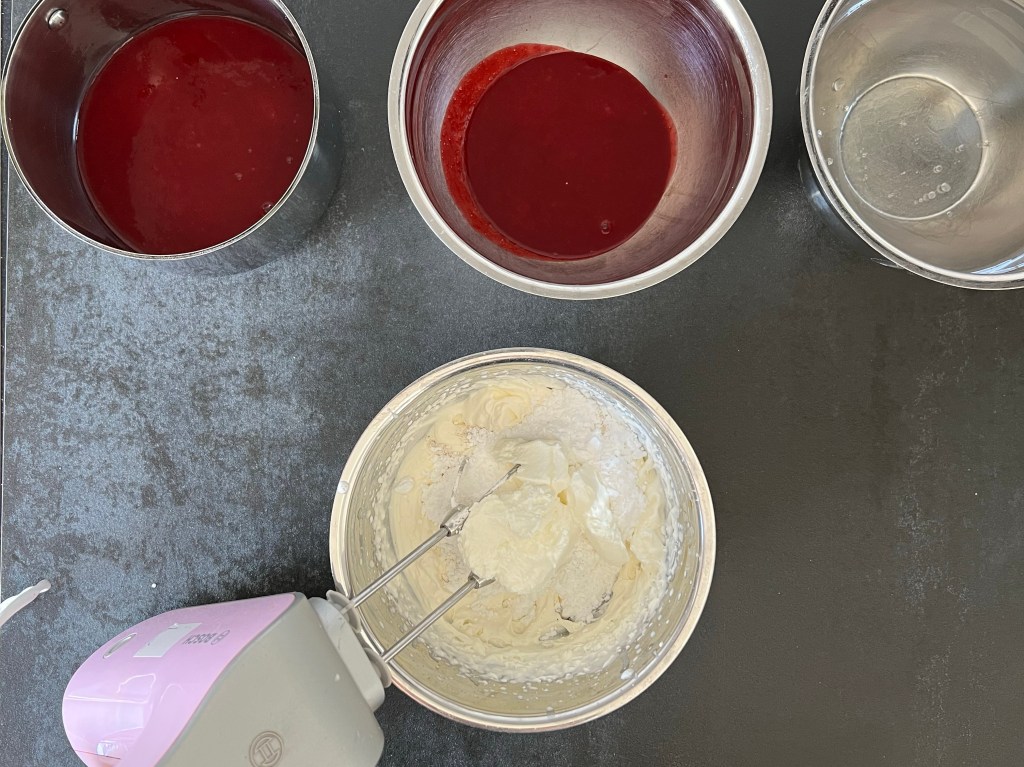 Efter det vispar jag grädden fast och vispar efter det ned sockret och den turkiska yoghurten. Jag passar även på att krama ur vattnet ur gelantinen och smälta den i hälften av purén, för att sedan blanda samman puréerna igen, så att man får ned temperaturen innan nästa steg.