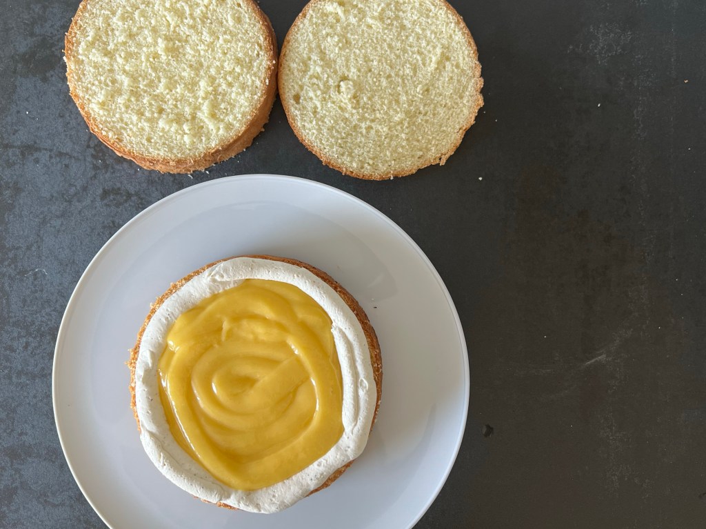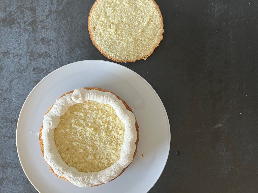 Nu är det dags att montera. Jag börjar med att dela tårtbotten i 3st skivor, med fördel använder man tårtsåg. Jag lägger första botten på ett tårtfat och spritsar en ring runt om med färskostcrémen. Innan för ringen lägger jag mangocurden, lika tjockt lager som jag spritsat ringen.