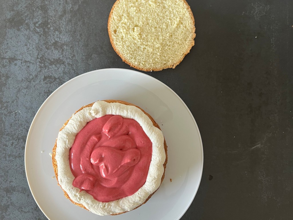 I nästa steg lägger jag nästa botten ovanpå mangocurden och spritsar en ring med färskostcréme runt kanten, fyller sedan tomrummet med hallonmousse.