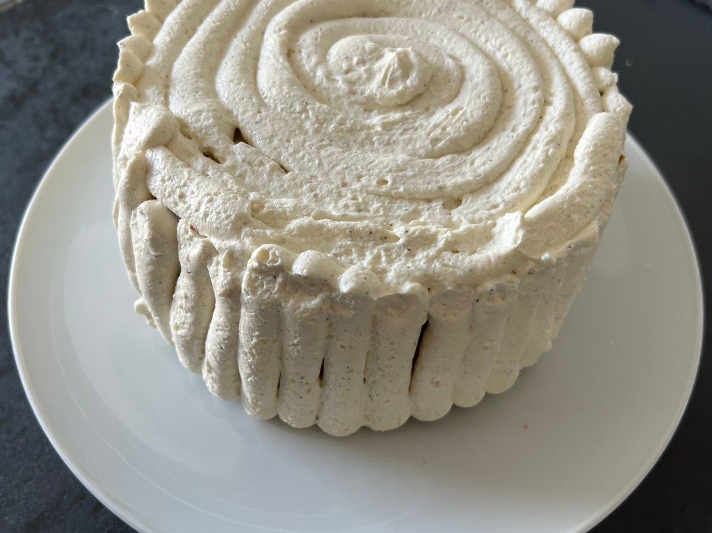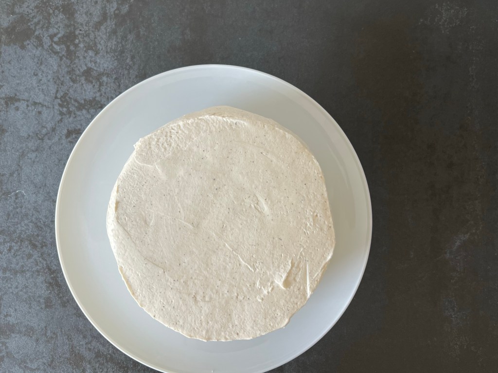 Jag väntar minst en timma, gärna 2 innan jag monterar tårtan. Vill att moussen börjar sätta sig, men inte är helt fast ännu. När jag är redo för att börjar bygga så vispar jag min färskostcréme, enkelt, stabilt och gott. Jag föredrar det framför smörkräm. Blanda lika delar vispgrädde och färskost samt florsocker och vaniljpulver i en skål, vispa tills fast konsistens.