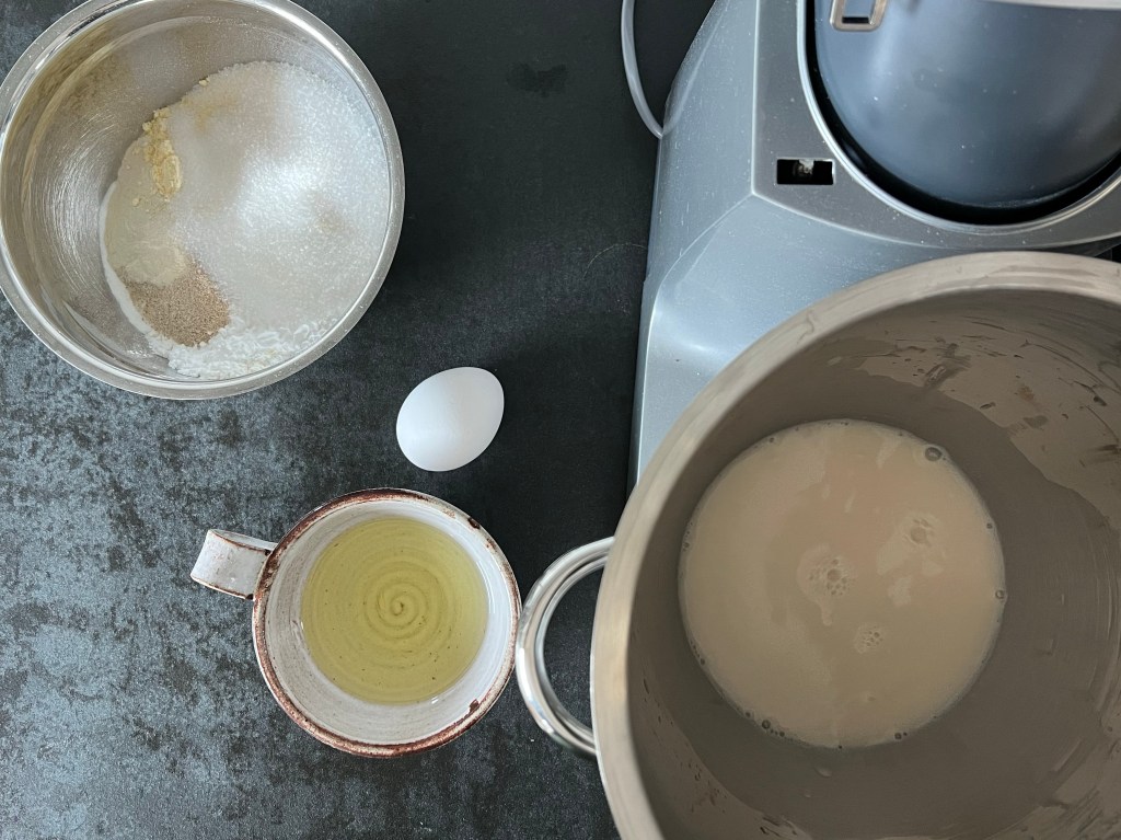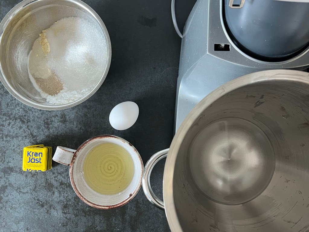 Först börjar jag med att väga upp allt, de torra i en skål och det övriga för sig. Löser sedan upp jästen i vattnet och tillsätter rapsolja och ägg, vispar samman.
