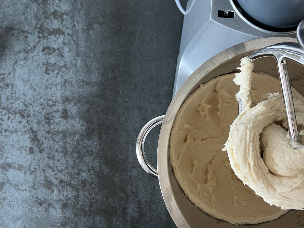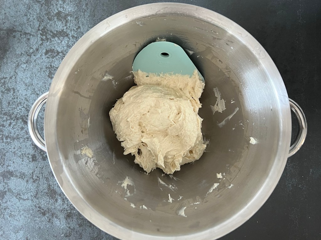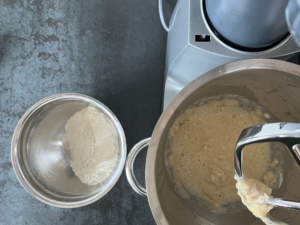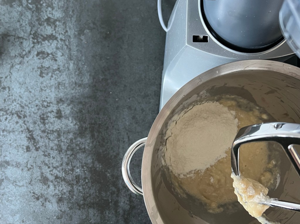 Efter det tillsätter jag hälften av mjölmixen och blandar samman, tillsätter sedan resten av mjölet och blandar på medelfart i 3-5min.