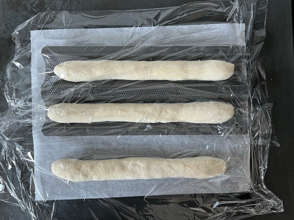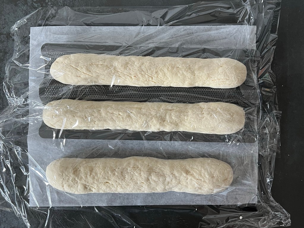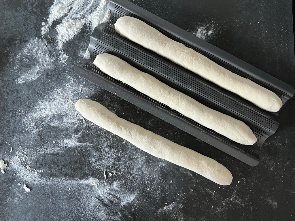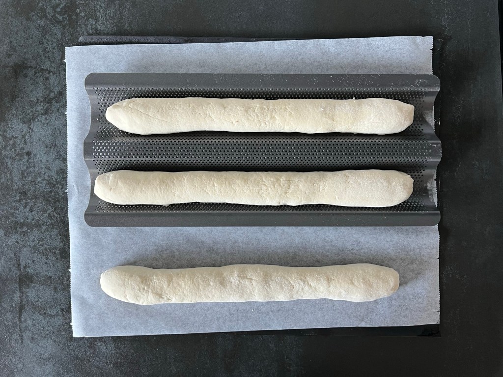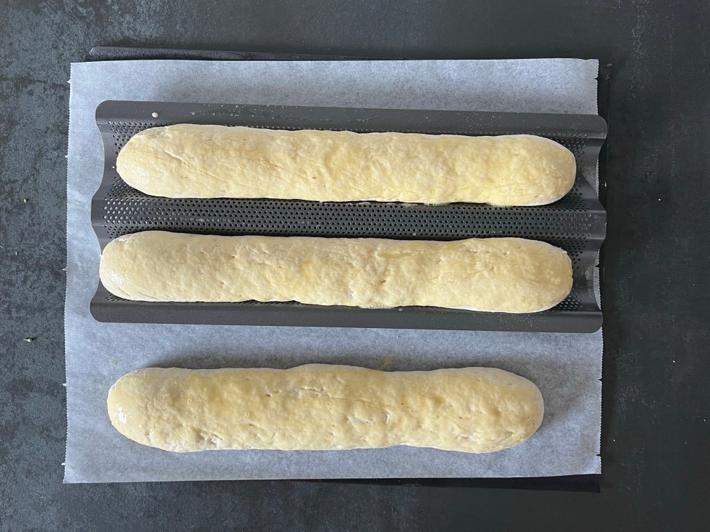 Skrapar samman degen och tar upp på mjölad bänk, mjölar och formar degen för att dela den i 3st lika stora bitar, ca 260g styck. Rullar dem till ca 35cm långa korvar och lägger på baguettplåt eller bakplåtspappersklädd plåt (bröden blir lite plattare på plåt och man får vara lite försiktigare när man borrar hålen). Plastar sedan lätt och jäser bröden.