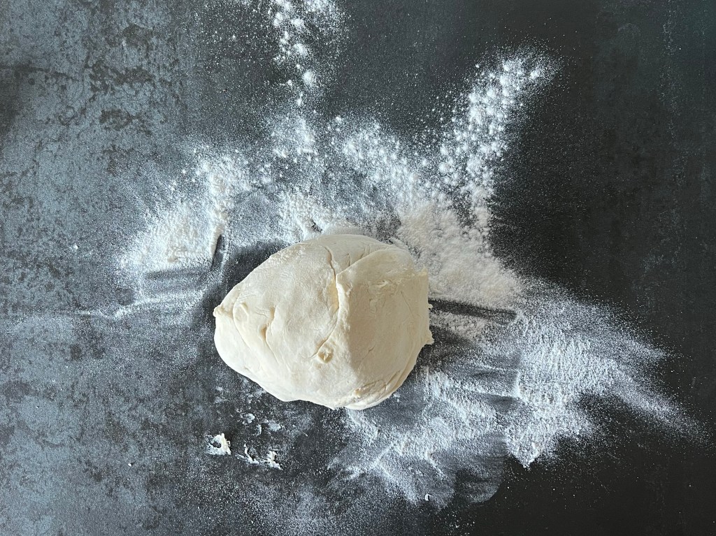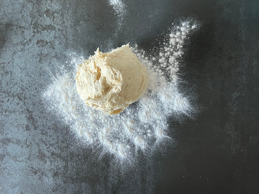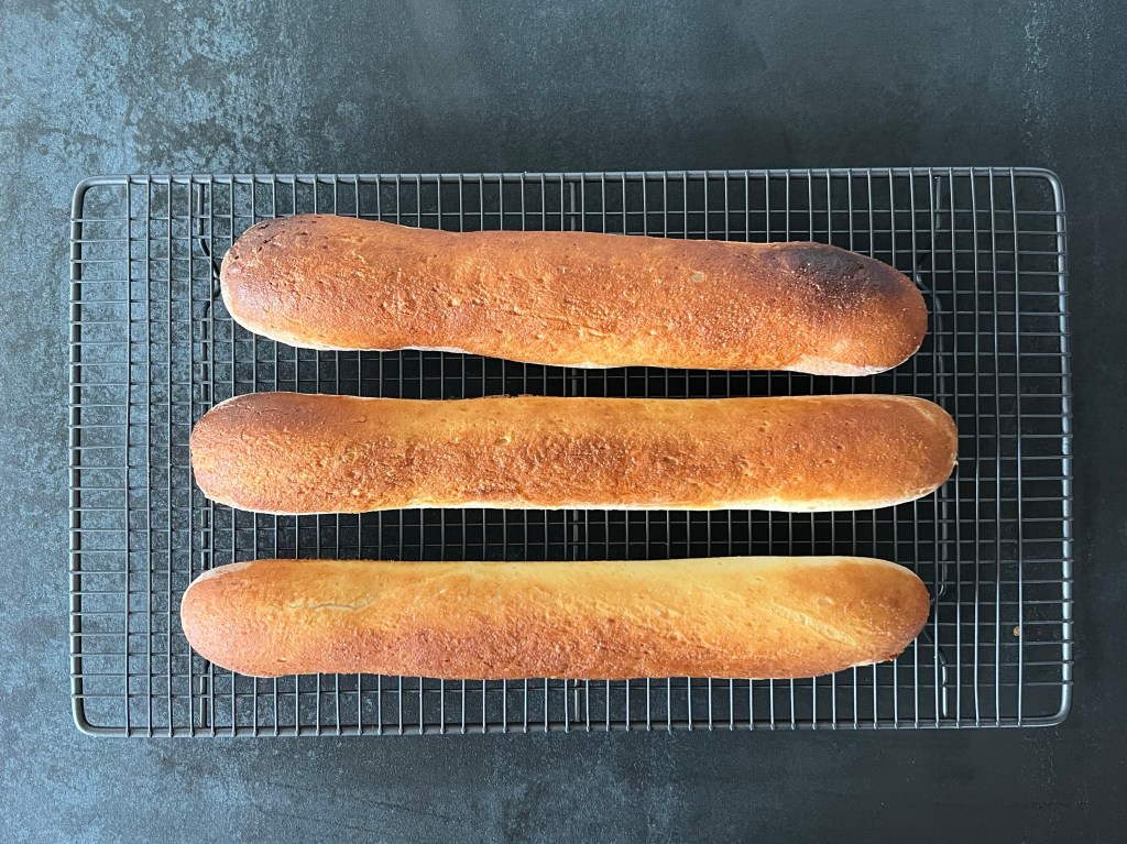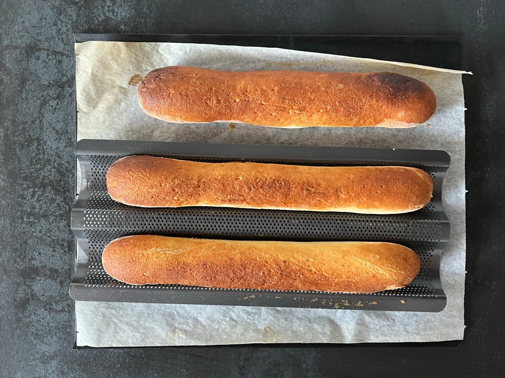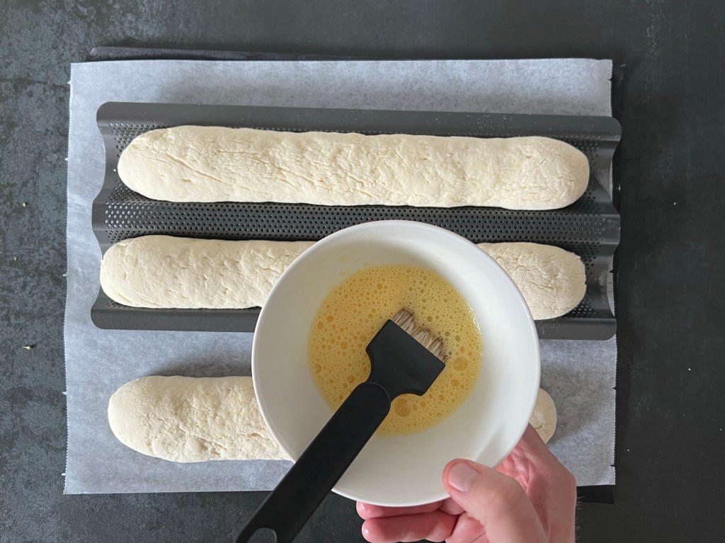 Skrapar samman degen och tar upp på mjölad bänk, mjölar och formar degen för att dela den i 3st lika stora bitar, ca 260g styck. Rullar dem till ca 35cm långa korvar och lägger på baguettplåt eller bakplåtspappersklädd plåt (bröden blir lite plattare på plåt och man får vara lite försiktigare när man borrar hålen). Plastar sedan lätt och jäser bröden.