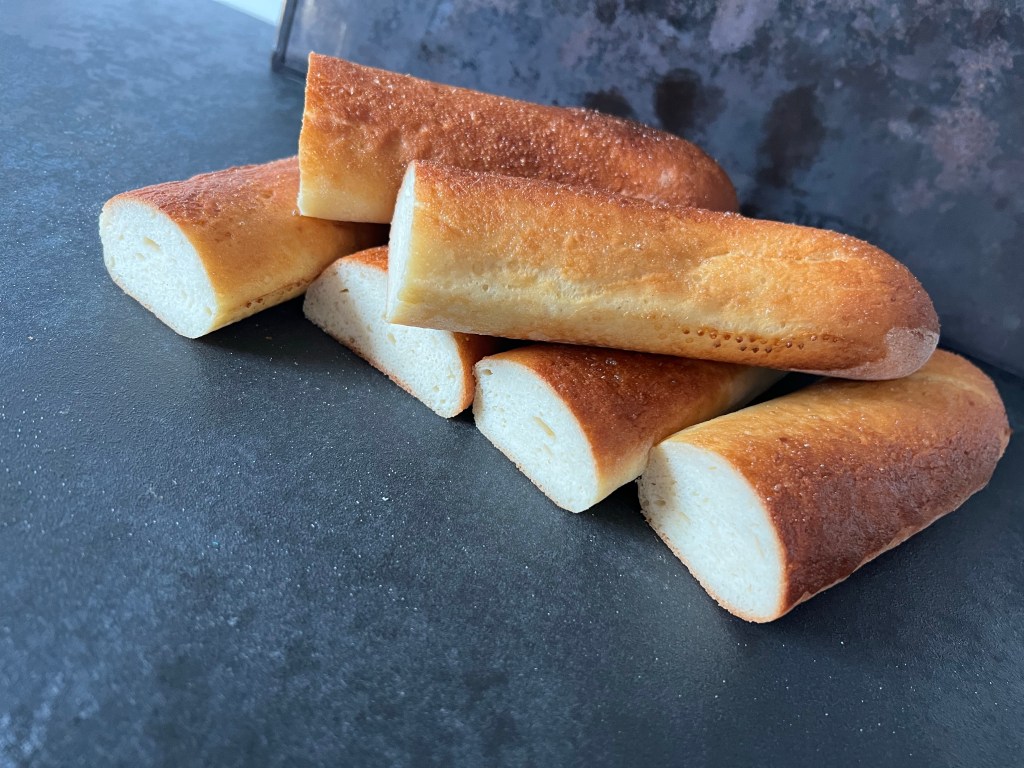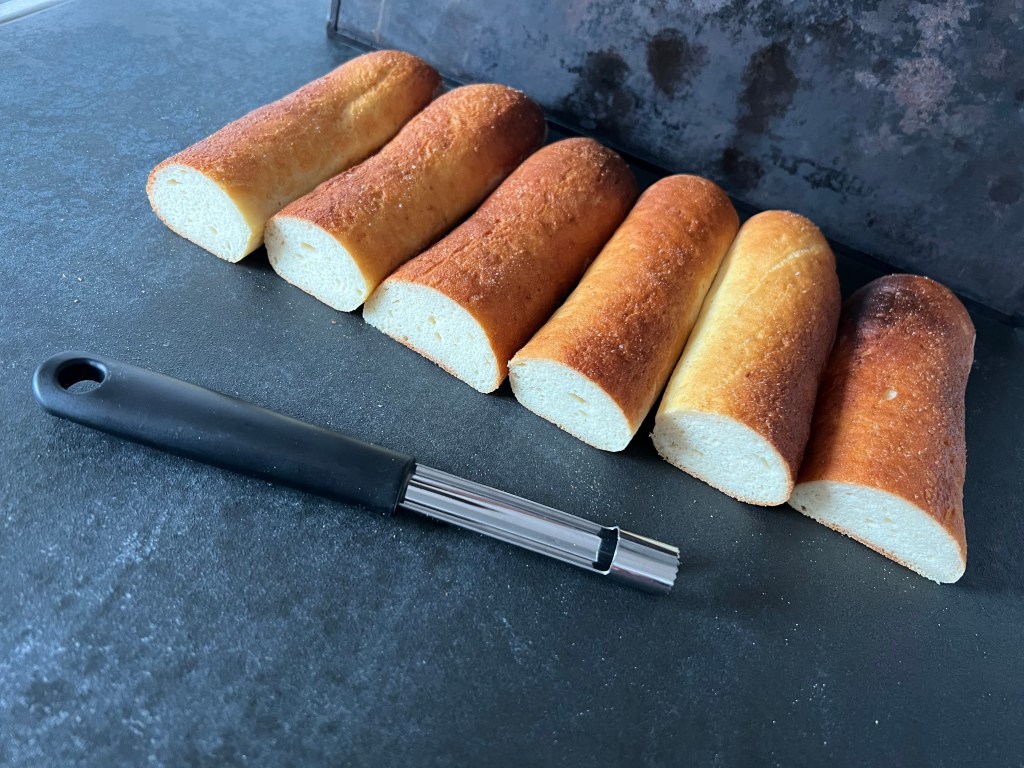 Som jag har tittat långt efter en French hot dog, läst på korvmenyer och hoppats, men till slut alltid funnit mig att de sällan ens har vanliga glutenfria korvbröd i korvkioskerna. Funderat till och från ganska länge i hur jag skulle lösa det och steg ett var när jag lyckades med ett riktigt bra korvbröd. Så i dessa bröden är det samma deg som till korvbröden, men större och så ”borrar” jag hål i dem med en äppelurkärnare. Det tog mig ett tag att klura ut vilket redskap jag skulle använda för att göra ett korvttjockt och 15-20cm långt hål i ett bröd med.