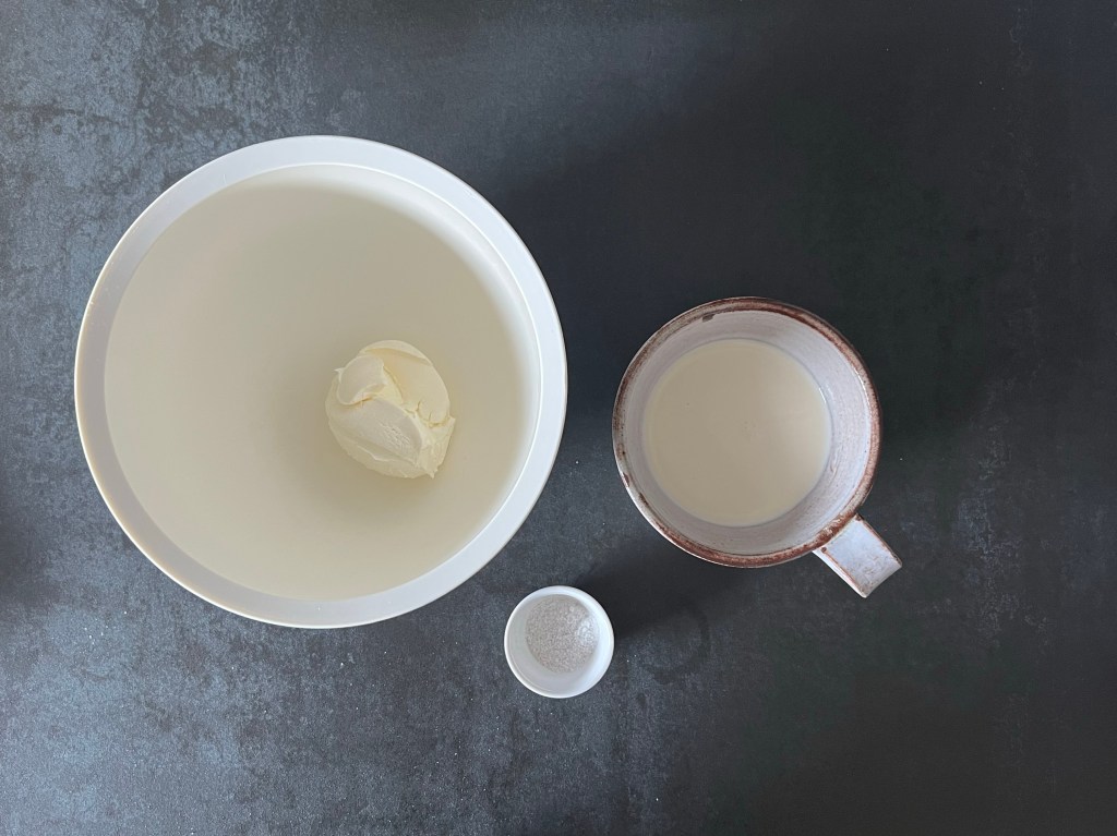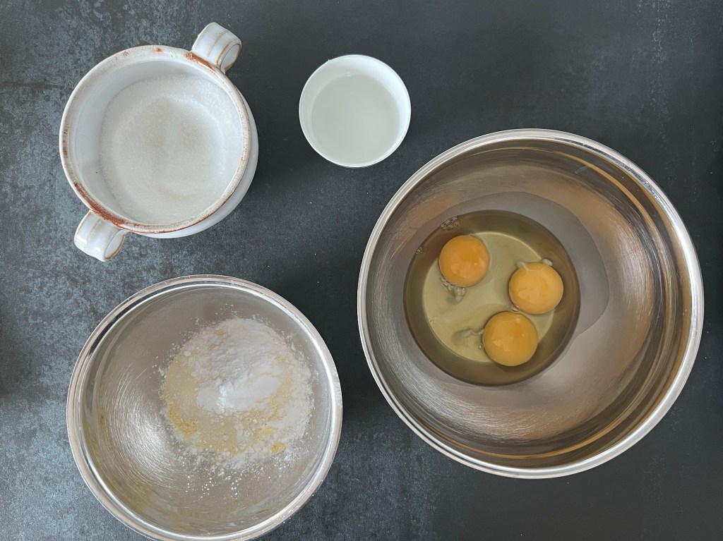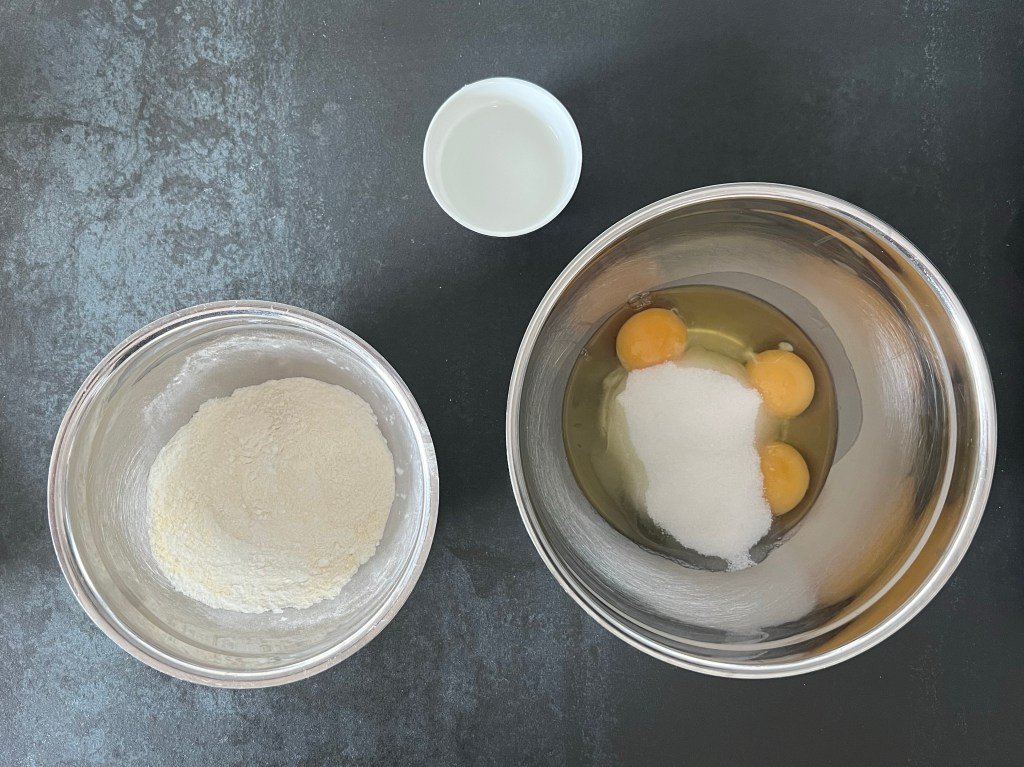 Jag börjar med rulltårtsbotten. Mäter upp alla ingredienser, ägg och socker i en bunke, alla torra i en skål och så värmer jag vatten. Sen vispar jag ägg och socker vitt och pösigt.