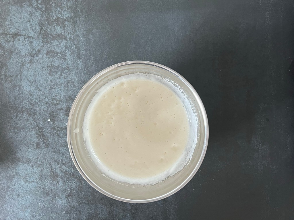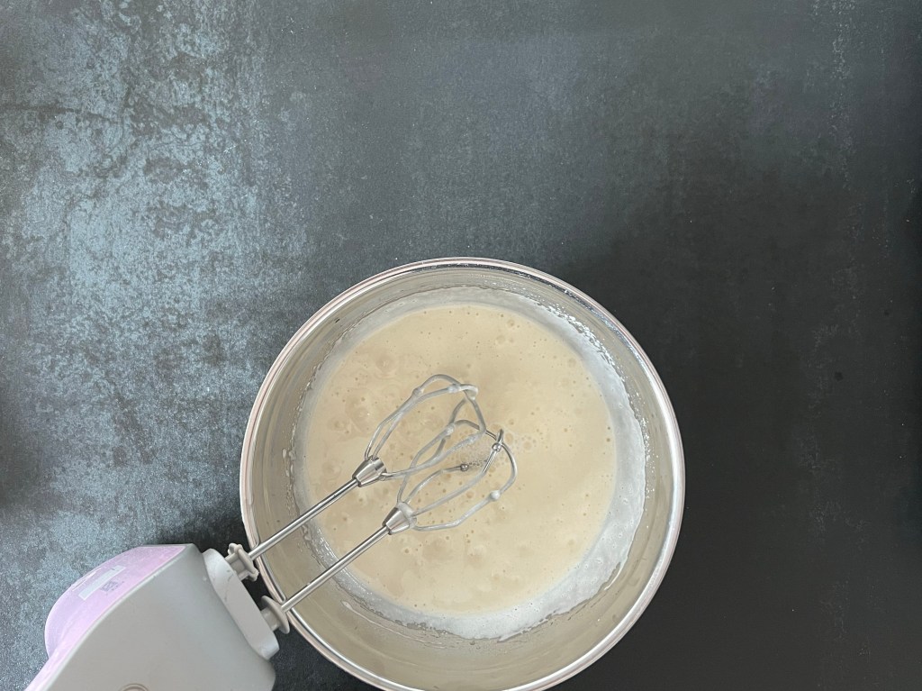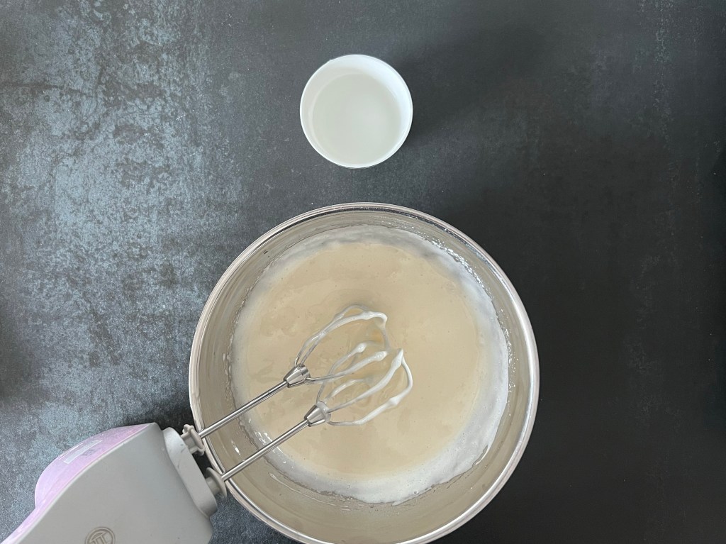 Tillsätter mjölmixen och vispar på låg hastighet till en klumpfri smet, efter det tillsätter jag hett vatten och vispar till en jämn smet.