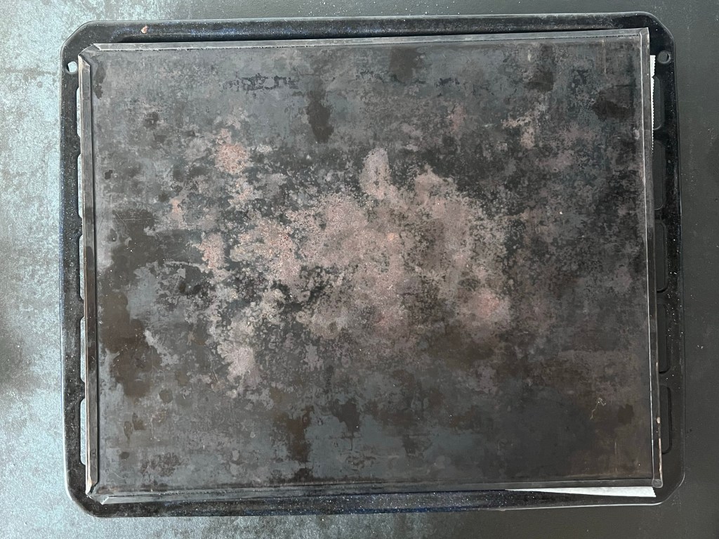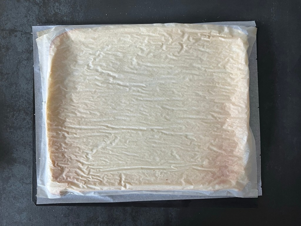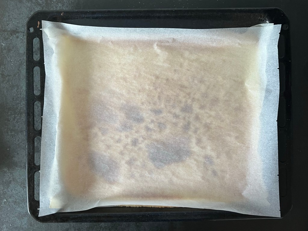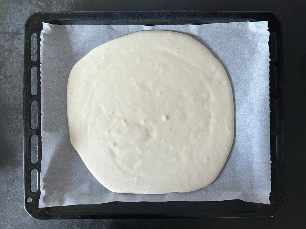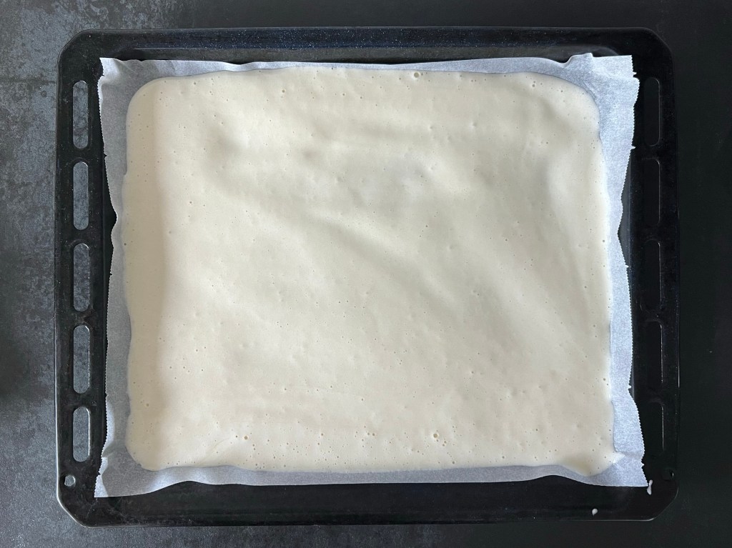 För över smeten på en bakplåtspappersklädd plåt och för ut i ett jämnt lager, på hela papperet. Efter det bakar jag av den i förvärmd ugn.