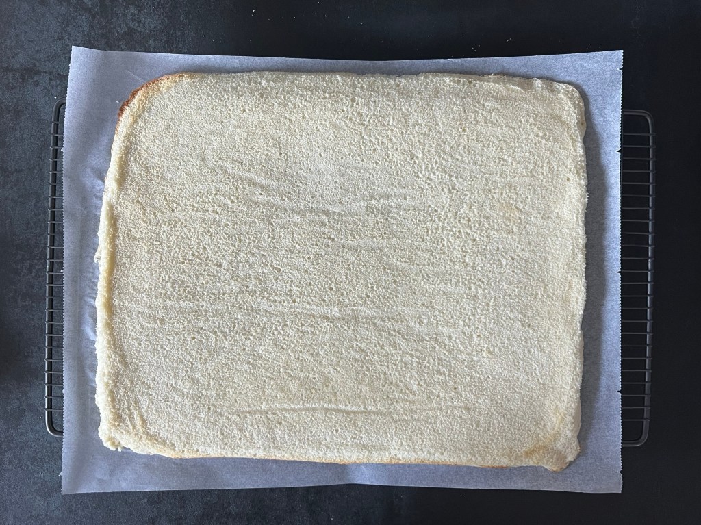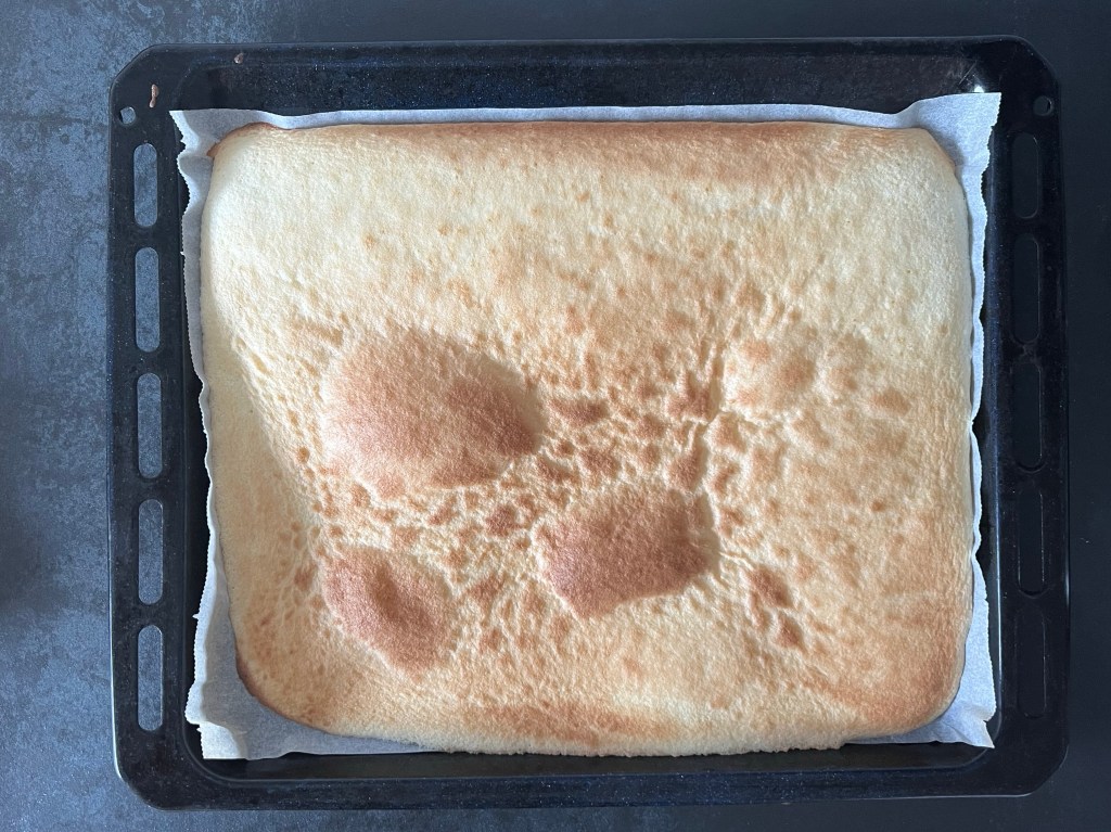 När kakan kommer ur ugnen strör jag strösocker ovanpå, lägger ett bakplåtspapper ovanpå, en plåt på pappret och sedan vänder jag den upp och ned. Pillar av pappret som den varit bakad på och låter den svalna på ett galler.