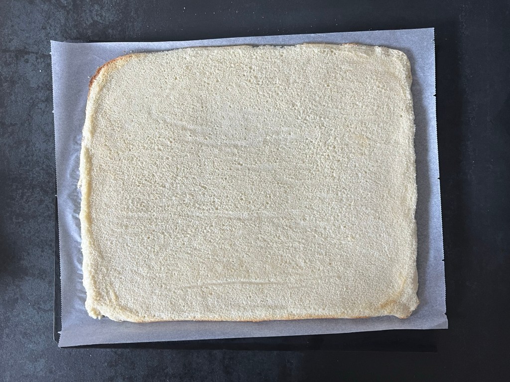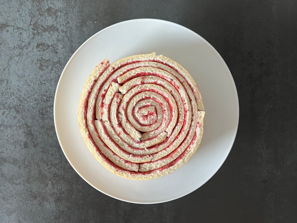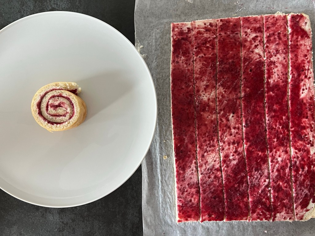 Sen måttar jag 4cm markeringar i båda kortsidorna på kakan, skär dem i jämna längder och tar ett tårtfat. Rullar första remsan till en smal rulltårta, lägger den i mitten på fatet och bygger sedan vidare från skarven med nästa remsa, osv tills alla remsor bildar en stor och platt rulltårta.