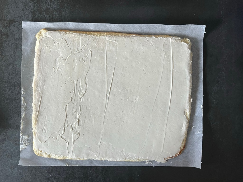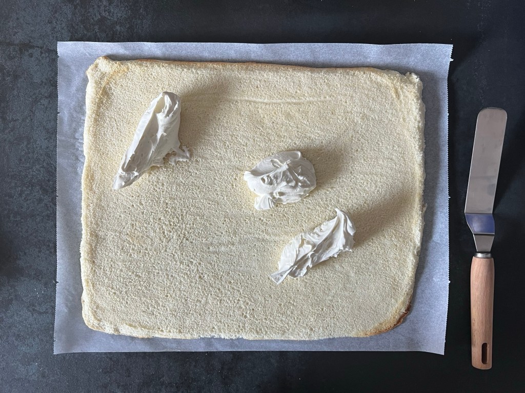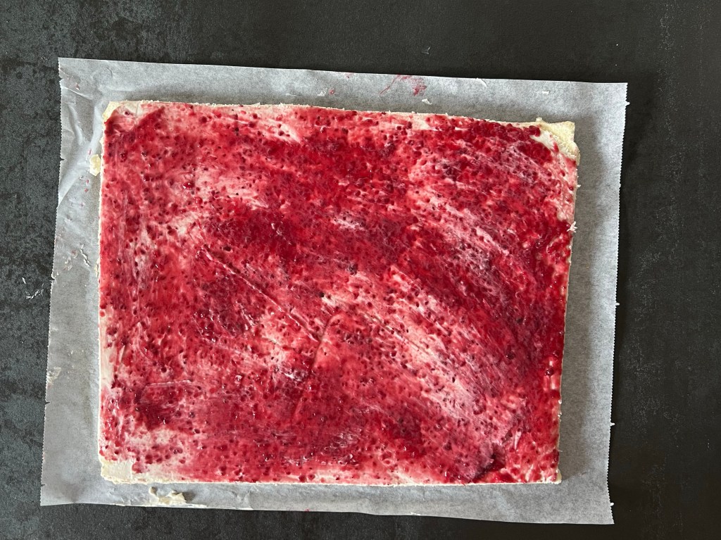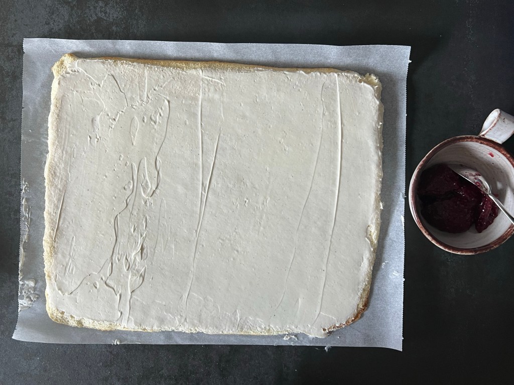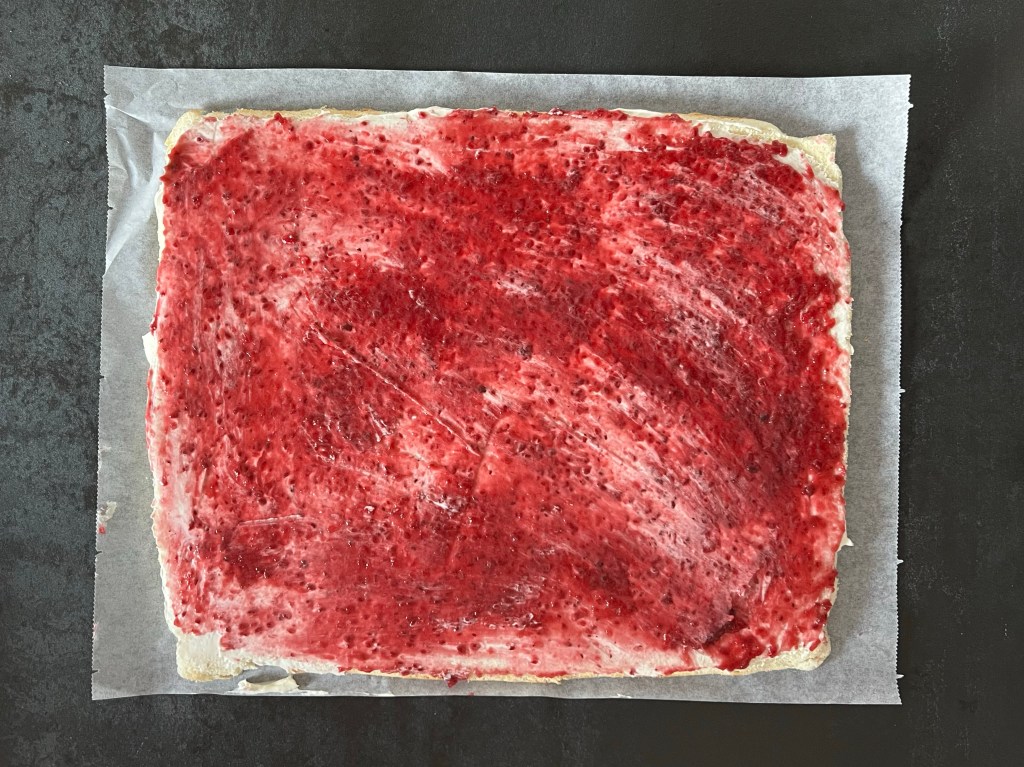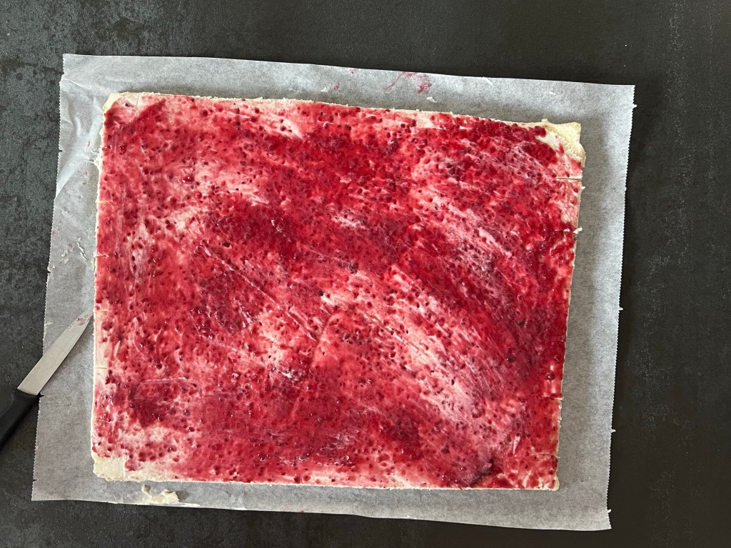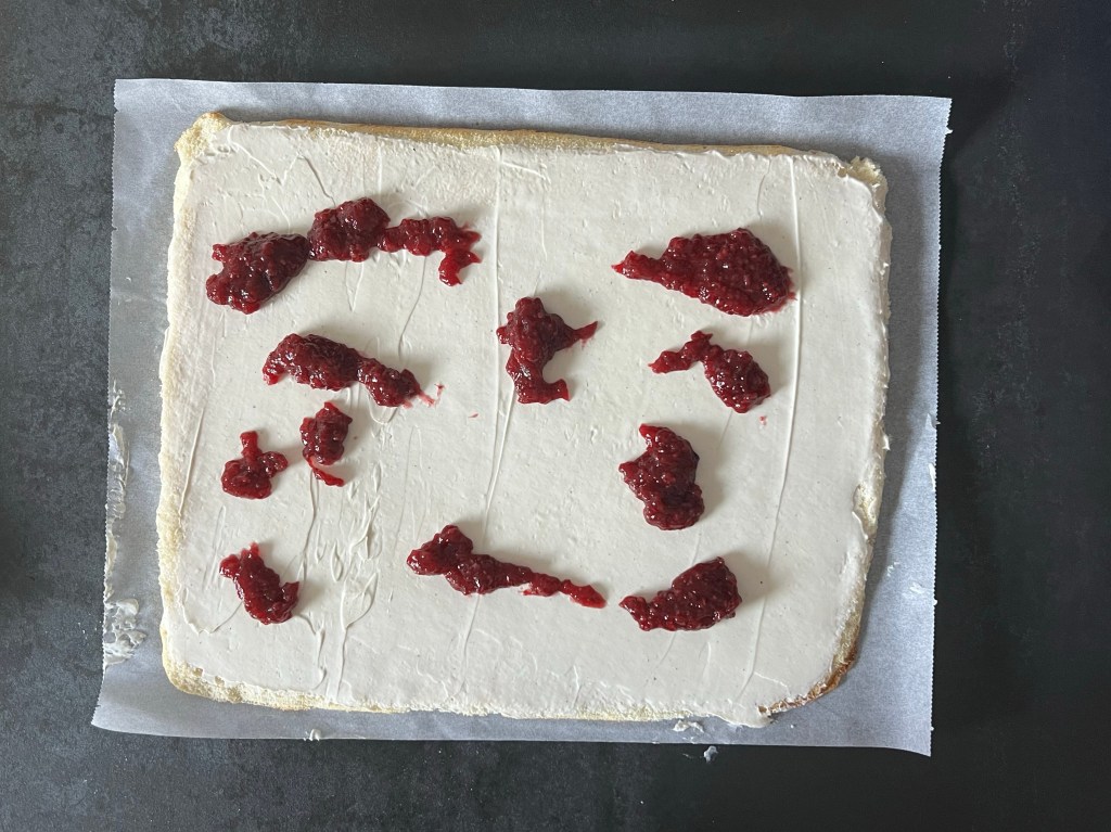 När rulltårtsbotten har svalnat så vispar jag färskostcréme och tar fram hallonsylt. Tar det mesta crémen men spar lite till sprittsningen senare. Bredde ut ett jämnt lager och breder ett jämnt lager hallonsylt ovanpå. Kantskära sedan så att det blir fyra jämna kanter.