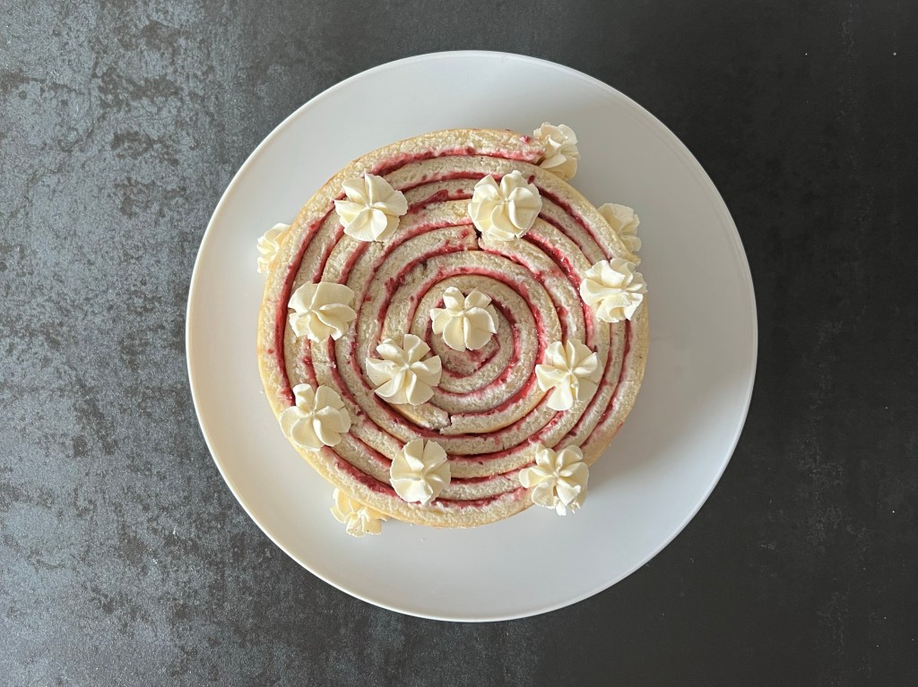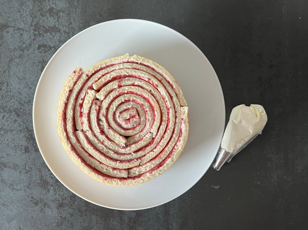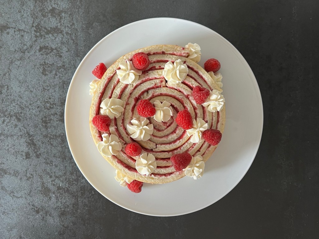 Ett lyxigt sätt att äta rulltårta på, eller ett grymt snabbt sätt att baka en tårta på. Helt enkelt en rulltårta, som man skär i jämna remsor och rullar till en stor skiva rulltårta, istället för en vanlig liten rulle. Min garnerar jag med färskostcréme och färska hallon. Resultatet blir en tårta full med smak och fyllning, saftig och söt i utseendet.