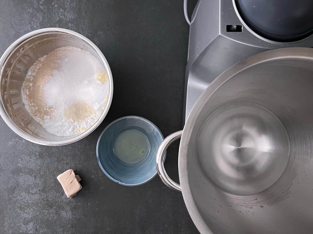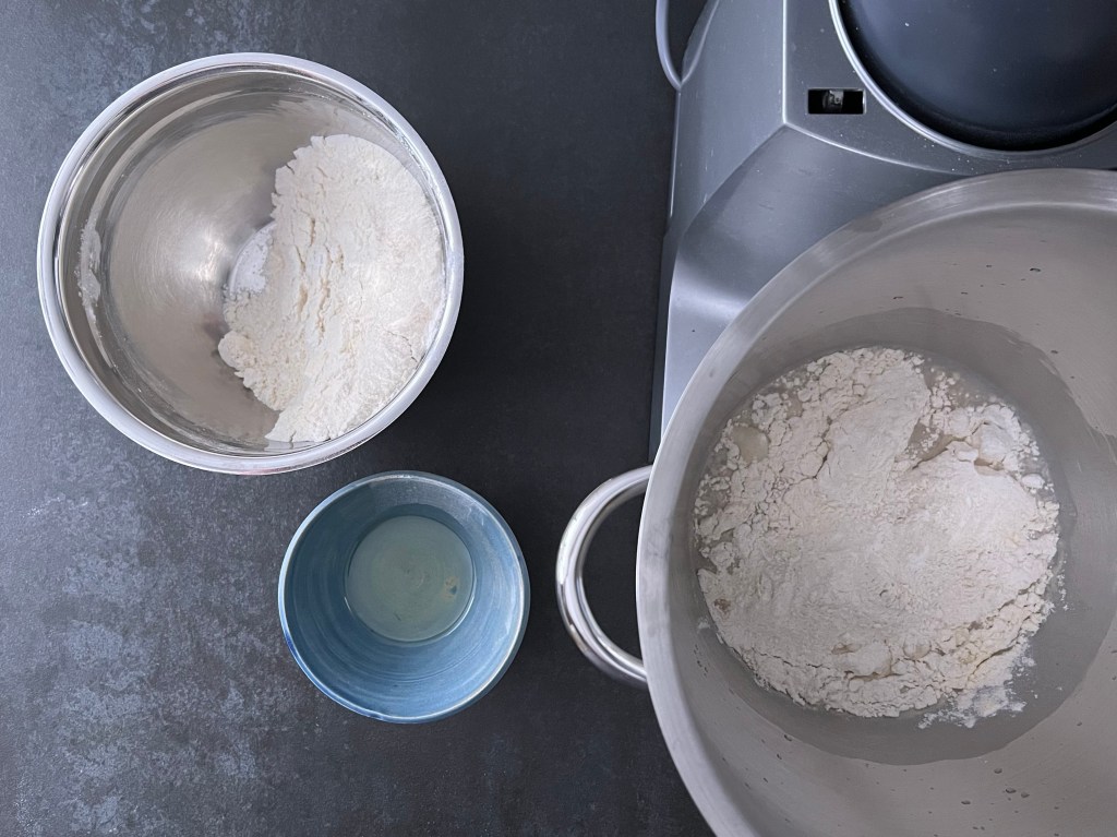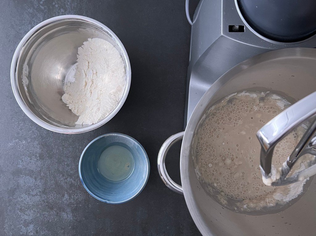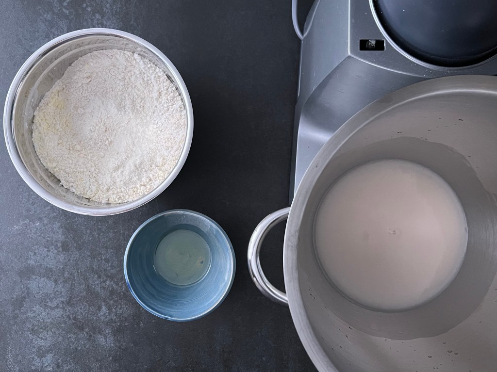 Jag börjar med att väga upp alla torra ingredienser i en skål och blandar till en mjölmix, sen väger jag upp vatten, jäst och olja. Löser upp jästen i vattnet och tillsätter hälften av mjölmixen.