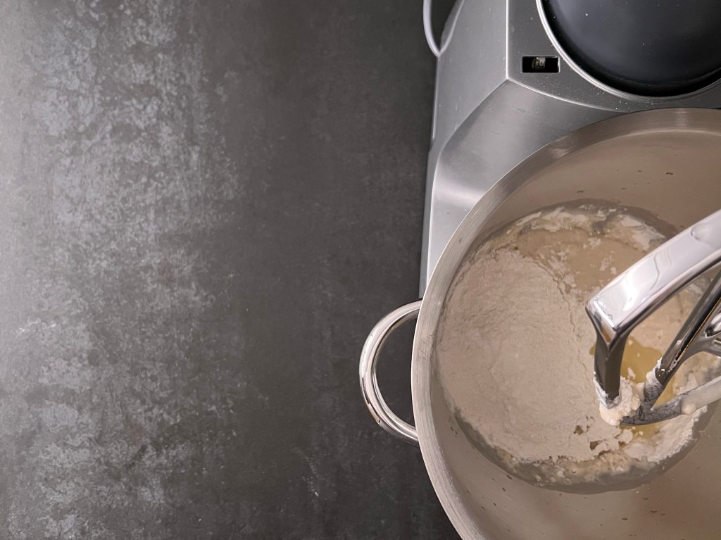 5. Stanna maskinen och tillsätt resten av mjölet samt oljan, kör samman degen och när mjölet är inarbetat öka farten till lite över medel och kör i 4min