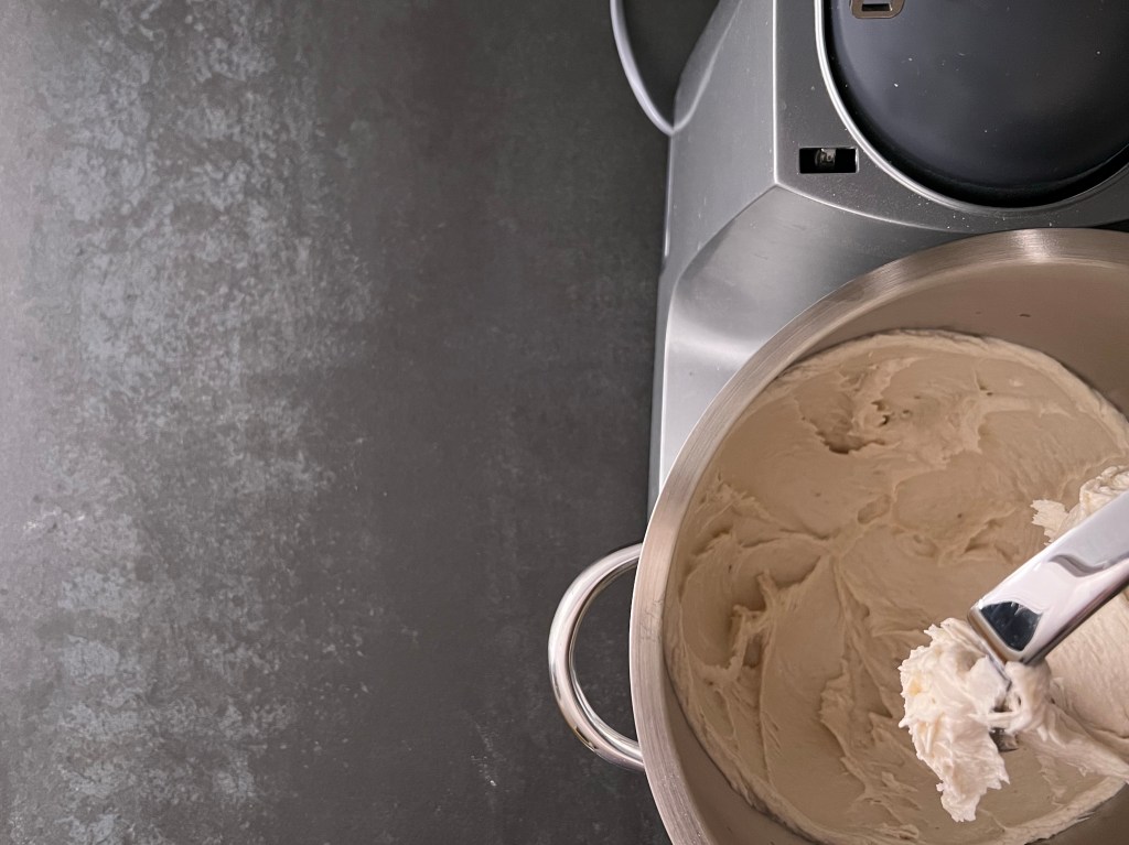 4. Tillsätt hälften av mjölblandningen och kör samman i maskinen, viktigt att använda vingen