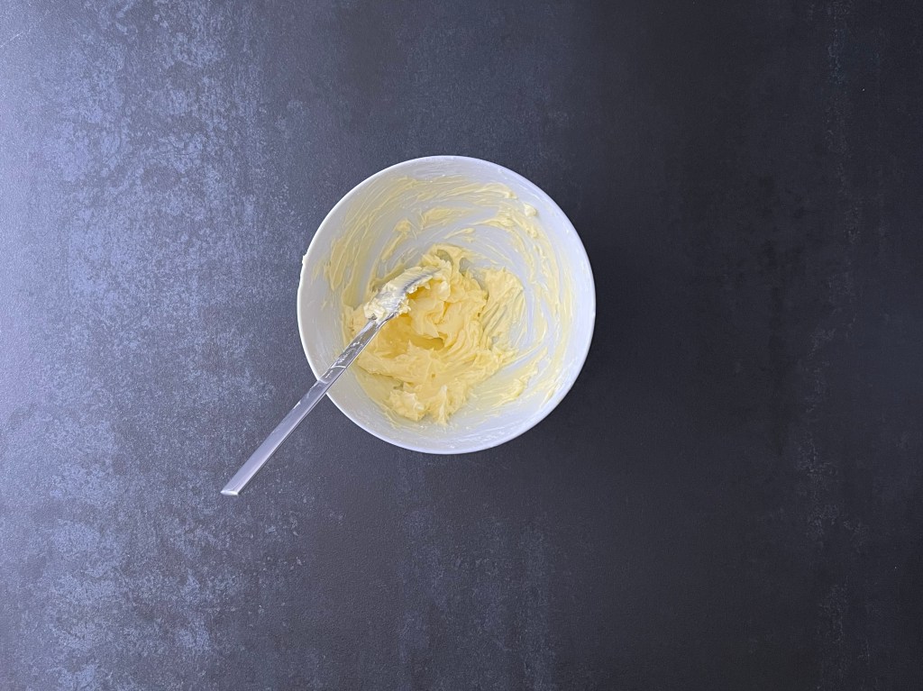 När degen vilar tar jag mjukt smör och majsstärkelse, blandar till en jämn massa med en gaffel. Viktigt att smöret inte är för hårt när man ska fylla bröden och att man arbetar mjukt och försiktigt, annars riskerar man att degen går sönder.