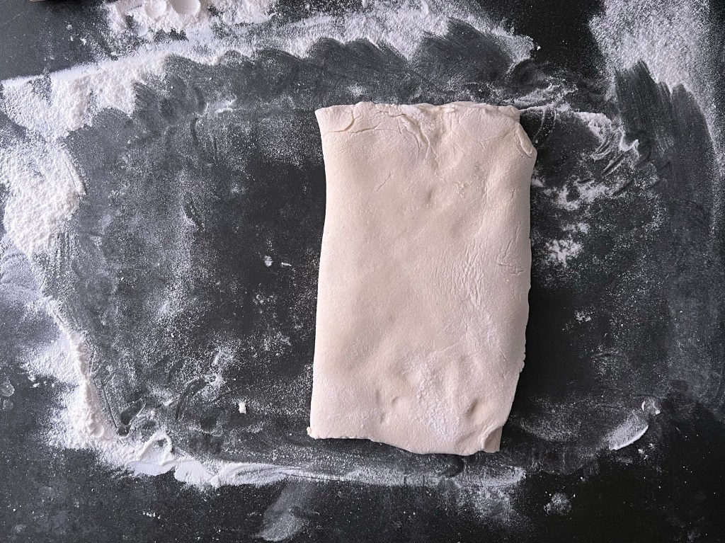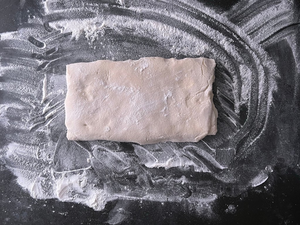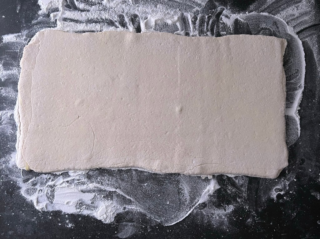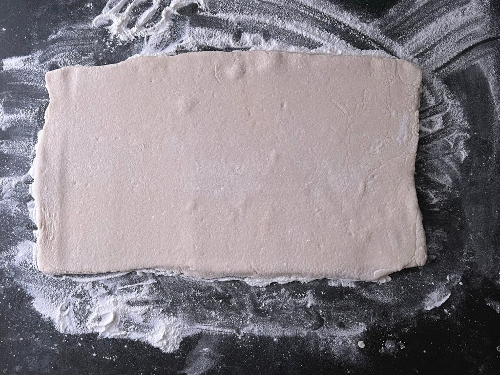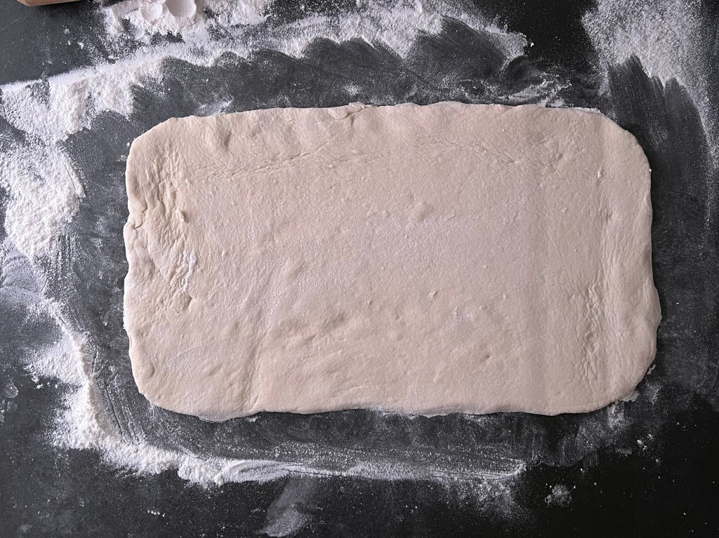 9. Ta upp degen på väl mjölad bänk, vänd runt den i mer mjöl och kavla mjukt ut den till 45x25cm
