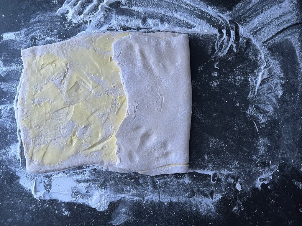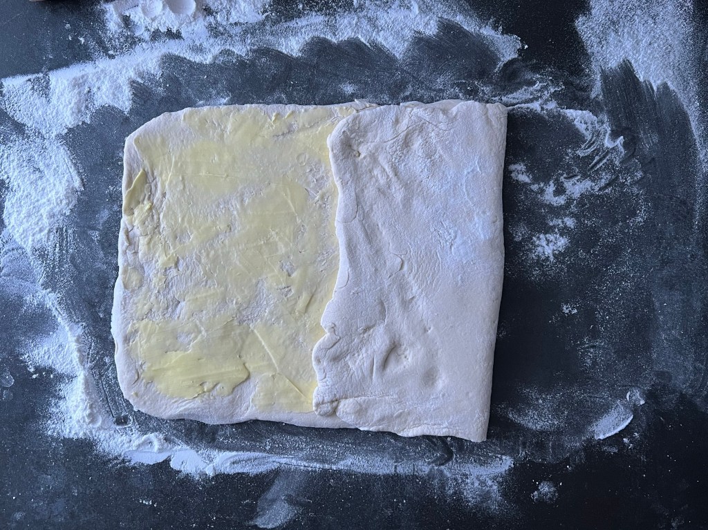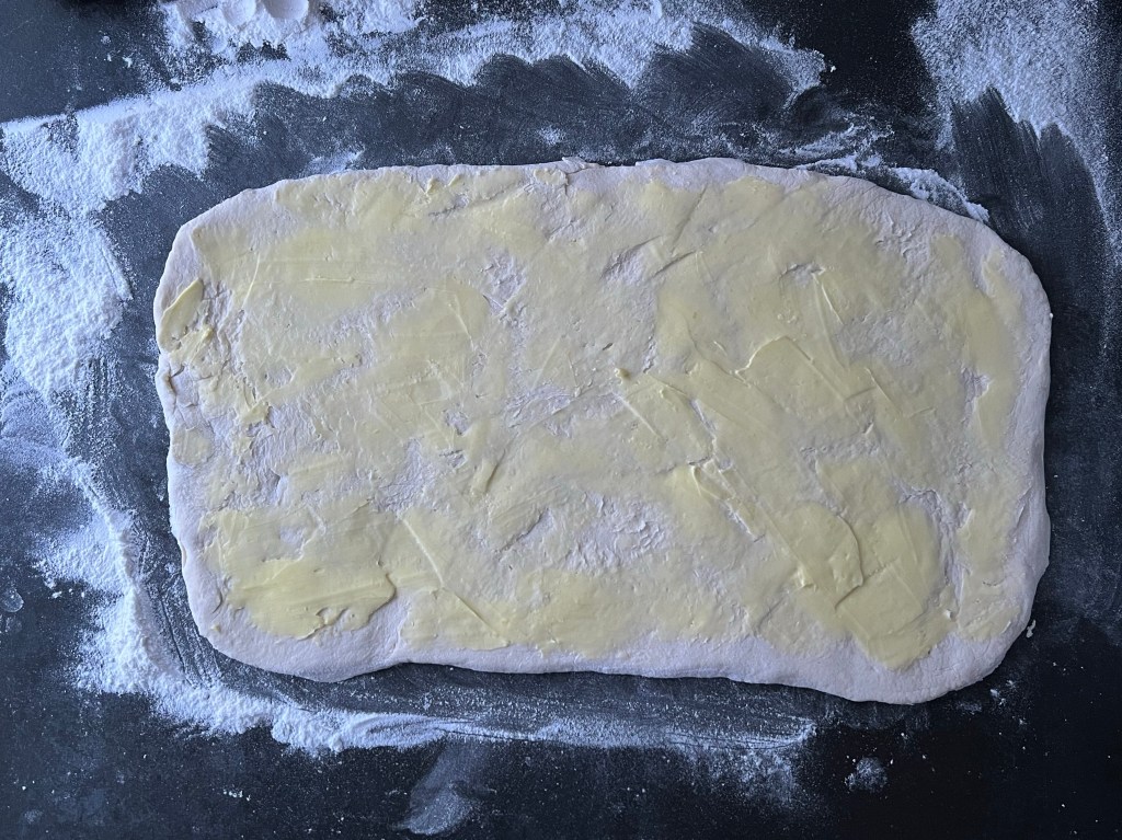 När degen vilat färdigt tar jag upp den på väl mjölad bänk, vänder runt den i mjölet och kavlar försiktigt ut den, lyfter och ser så att den är mjölad under och även över, så att den inte fastnar. När den är 45x25cm så breder jag ut hälften av smöret. Över hela, (går bra att breda över 2/3 också, då man viker den) och viker in 1/3 mot mitten, sedan viker jag den andra sidan över. Vrider degen ett kvarts varv, ser över mjölningen och kavlar åter ut den till 45x25cm.