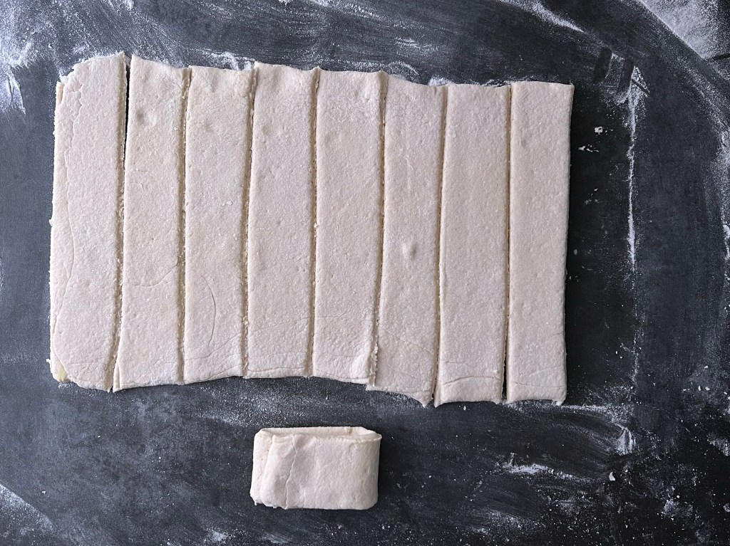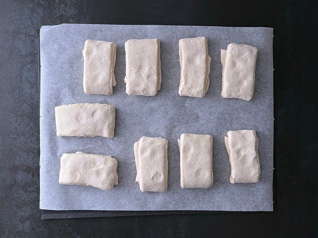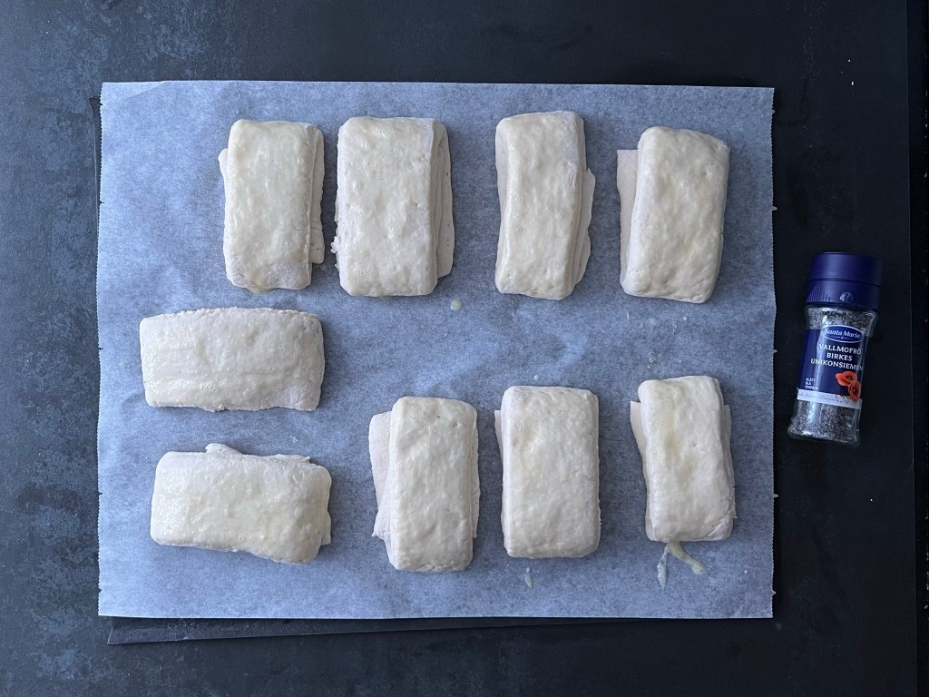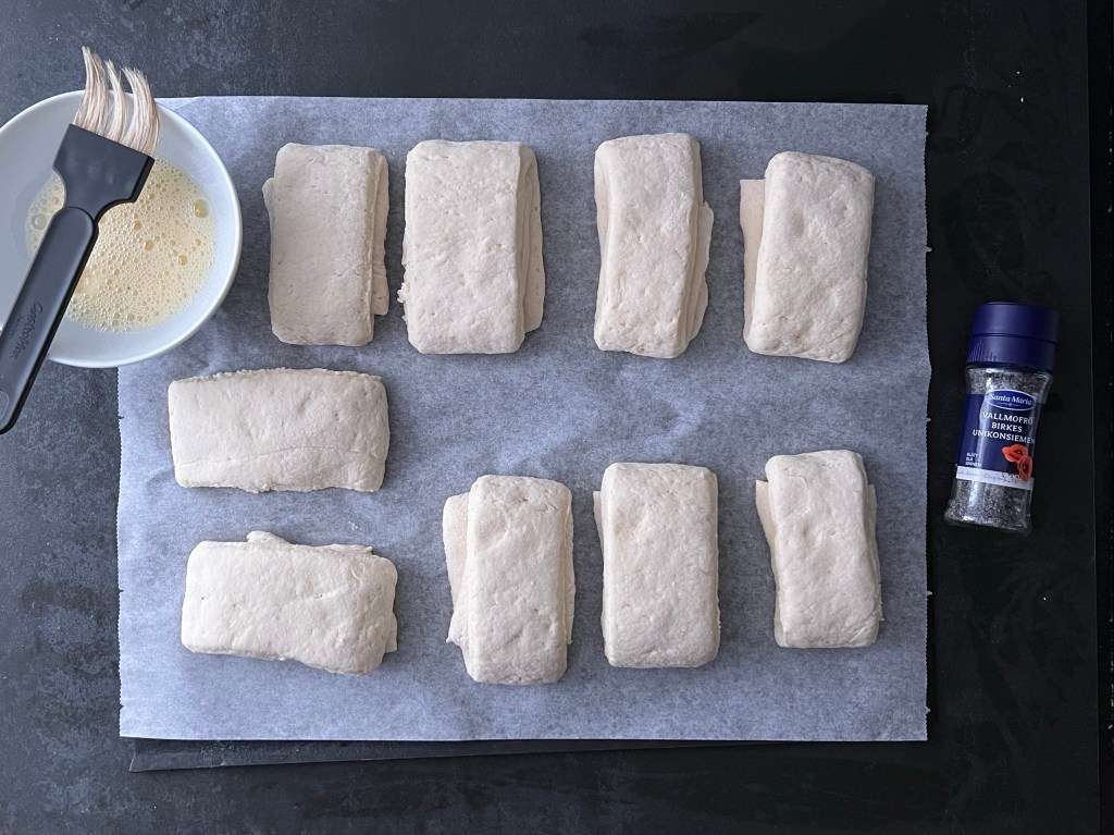 Jag kantskära kortsidorna och mäter sedan upp i 5cm bitar. Skårar degen och vänder upp och ned, för att borsta bort överflödigt mjöl. Viker 1/3 in mot mitten och viker andra sidan över, lägger dem sedan med skarven nedåt på en bakplåtspappersklädd plåt.