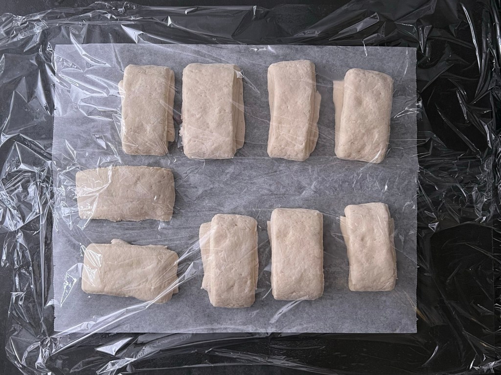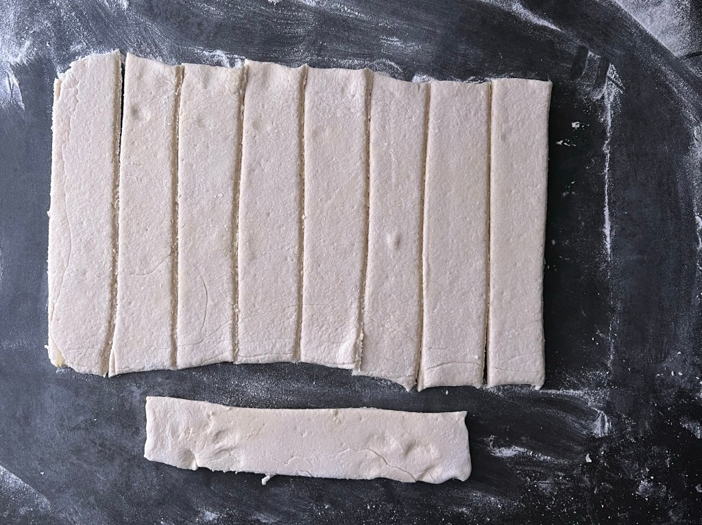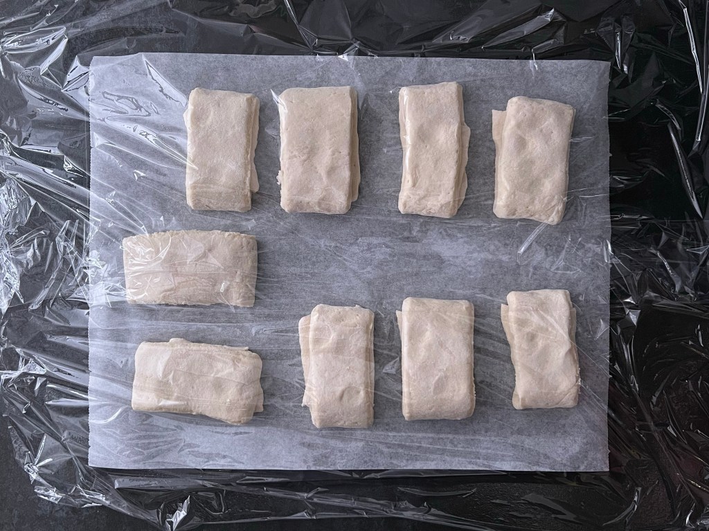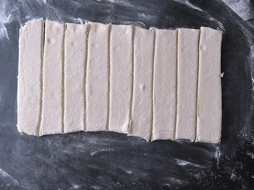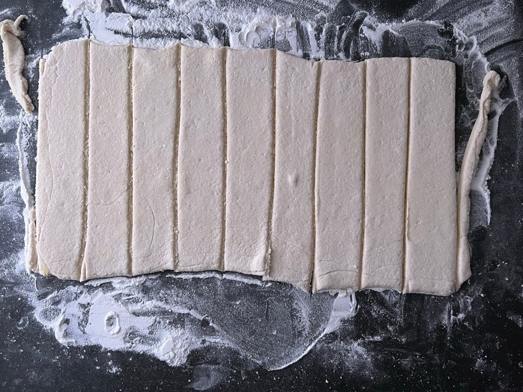 Jag kantskära kortsidorna och mäter sedan upp i 5cm bitar. Skårar degen och vänder upp och ned, för att borsta bort överflödigt mjöl. Viker 1/3 in mot mitten och viker andra sidan över, lägger dem sedan med skarven nedåt på en bakplåtspappersklädd plåt.