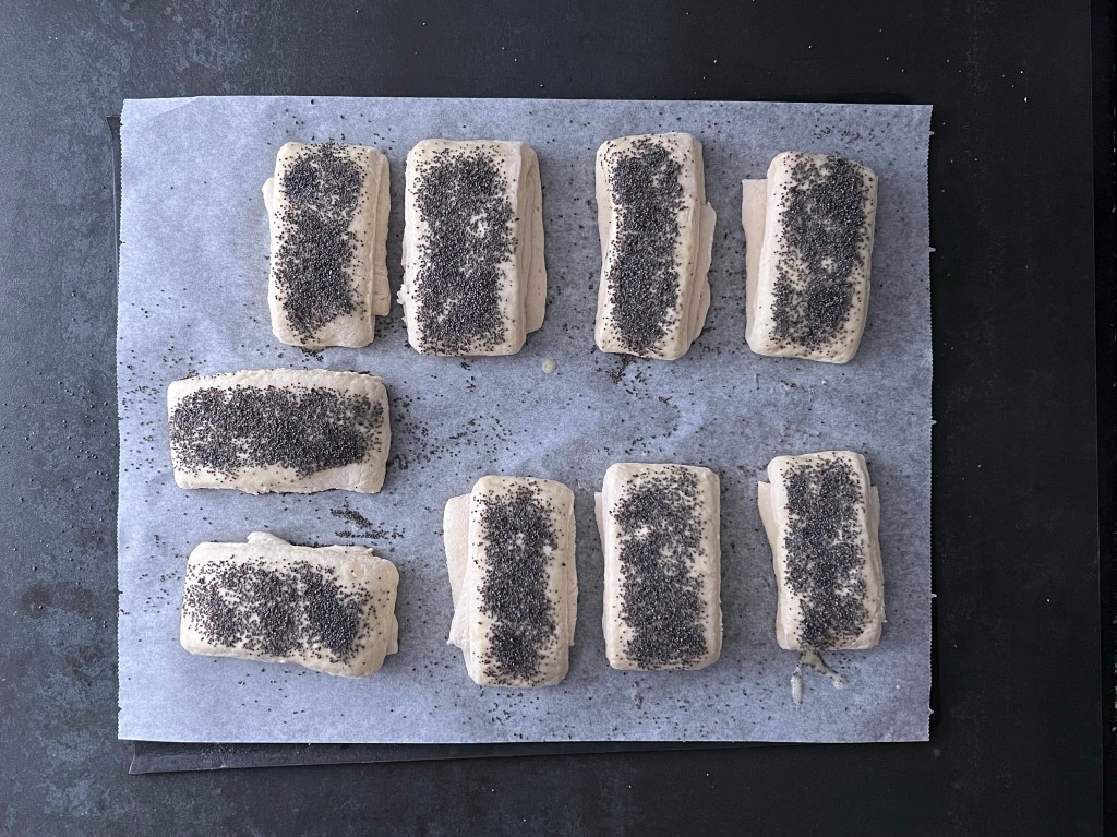 Plastar plåten lätt och jäser i ca 45min. Vispar ett ägg med lite vatten och salt, penslar bröden och strör över ett rejält lager vallmofrön innan jag bakar av dem. När de kommer ur ugnen får de svalna en kort stund på ett galler innan servering. När de kallnar blir de lite torra och kompakta, men det beror framförallt på att smöret stelnar, värm dem en kort stund i mikron så blir de mjuka och fluffiga igen.