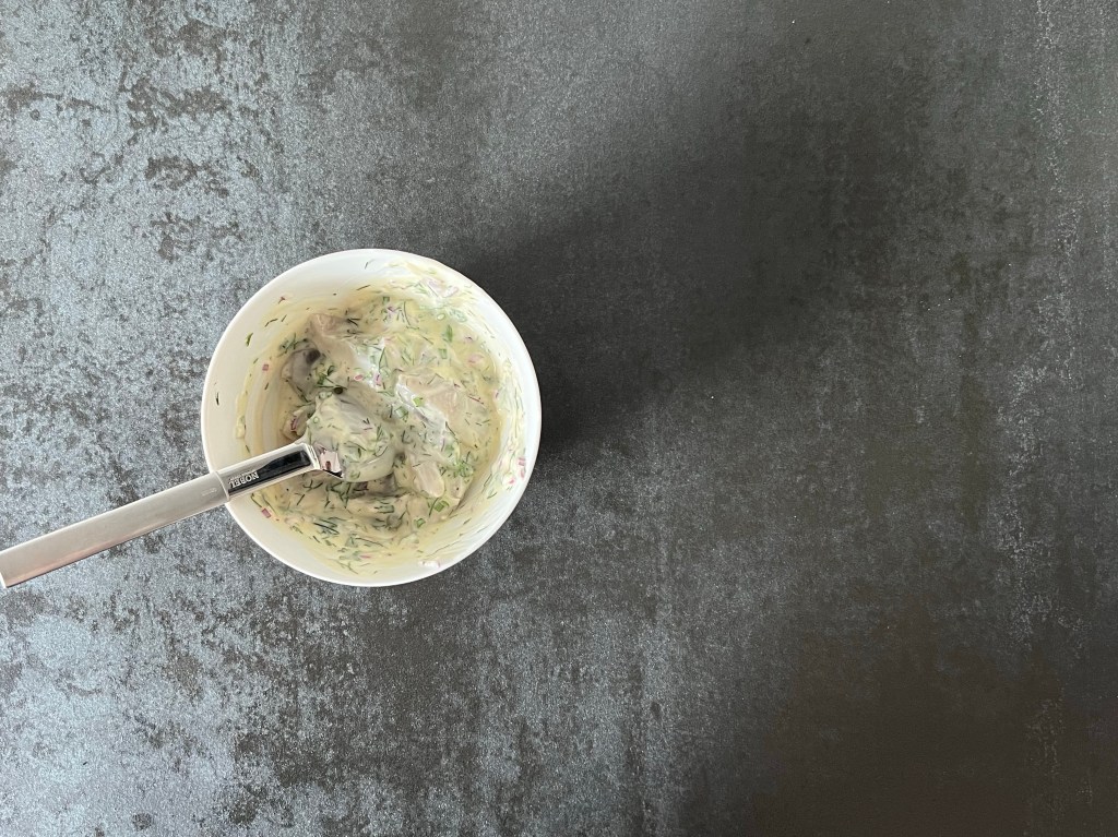 4. Blanda majonnäs, kapris, örter, lök, dijonsenap och sirap i en skål
