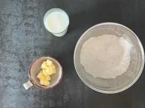 Först blandar jag alla torra ingredienser till en mjölmix och så tärnar jag smöret.