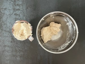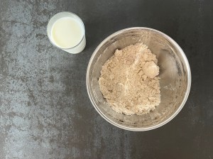 Smöret nyper jag in i mjölet till en lätt grynig massa. Sen tillsätter jag mjölken och arbetar samman degen med en träslev.