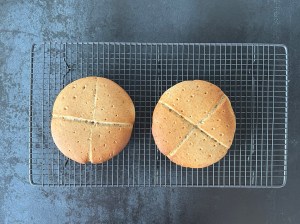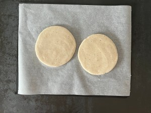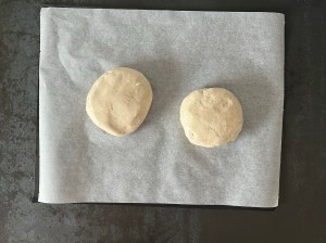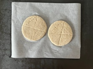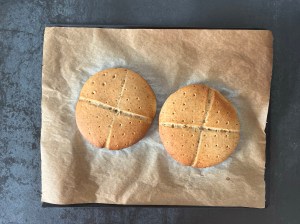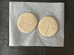 Jag lägger bollarna på en bakplåtspappersklädd plåt, mjölad dem på toppen och plattar ut till cirka femton centimeter stora kakor. Därefter naggar jag dem, skårar kryss i dem och pudrar med lite mjöl ovanpå, innan de bakas av.