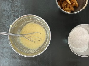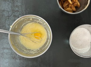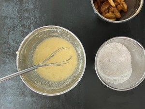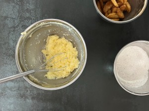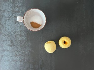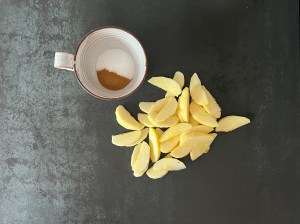 Jag börjar med äpplena. Skalar och kärnar ur dem, sedan klyftar jag dem rätt runt och vänder runt i kanelsocker.
