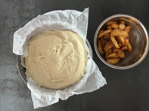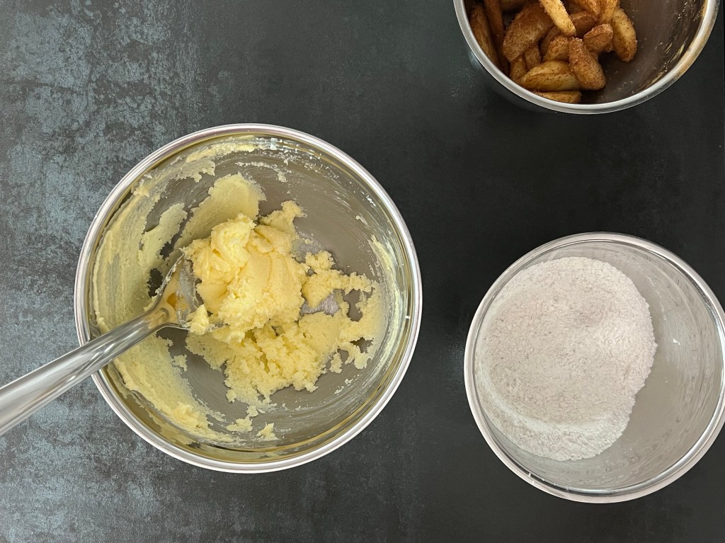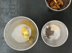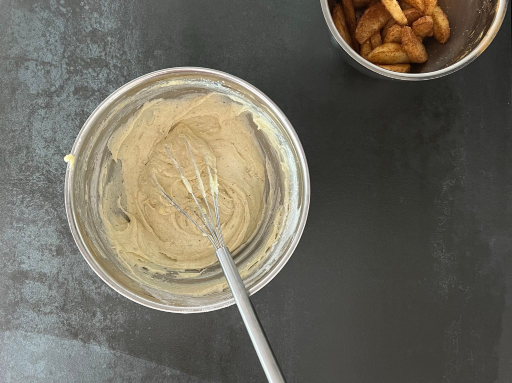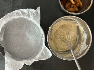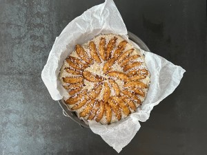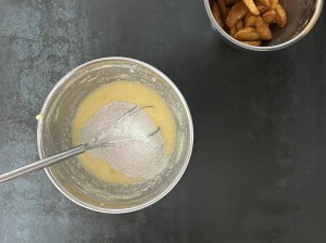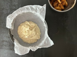 Jag tillsätter sedan mjölmixen och vispar samman till en slät smet. För över den i en springform på ca 25cm som jag klätt med bakplåtspapper. Äppelklyftorna sätter jag ned i smeten, toppar den sedan med pärlsocker innan jag bakar av den i förvärmd ugn.