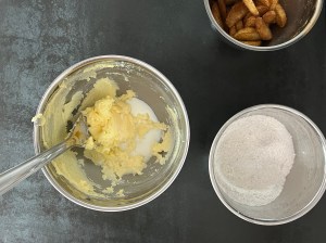 Efter det blandar jag alla torra ingredienser förutom sockret, till en mjölmix. Jag rör samman mjukt smör och socker. Tillsätter mjölken och rör/vispar jämnt. Efter det tillsätter jag ett ägg i taget och vispar ut till en smet.