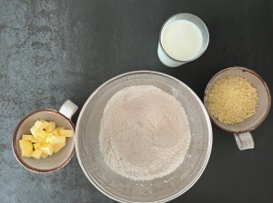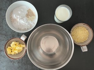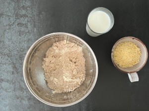 Jag börjar med att väga upp alla torra ingredienser i en skål, tärna det kalla smöret, väga upp mjölken och osten, och självklart starta ugnen. Sen blandar jag de torra ingredienserna till en mjölmix i en bunke.