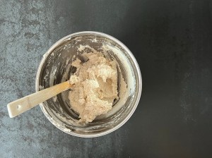 Därefter nyper jag in smöret i mjölmixen, till en gryning massa. Tillsätter den rivna osten och blandar samman med en träslev.