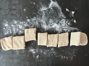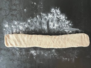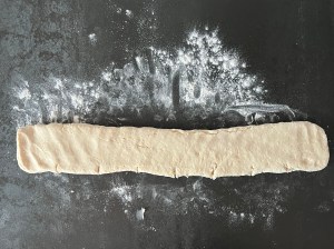Jag mjölar bänken lätt och tar upp degen på den. Strör lite mjöl ovanpå och rullar till en lång korv, ca 40cm lång. Efter det plattar jag korven med handen, så att det blir en rektangulär platta, 8cm bred och 50cm lång. Plattan delar jag i 8st bitar om ca 6cm.
