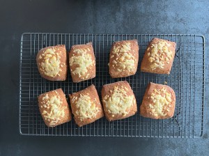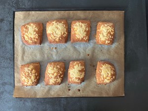 Jag lägger bitarna på en bakplåtspappersklädd plåt och strör över lite riven prästost. Bakar sedan av dem och låter dem svalna en kort stund på ett galler innan servering.