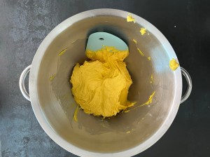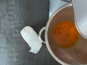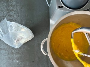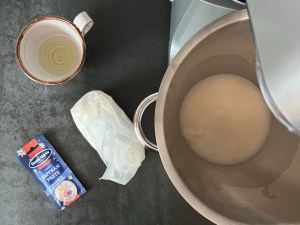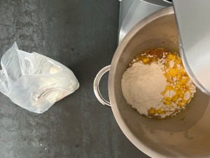 Första momentet med degen är att jag börjar med att väga upp alla ingredienser. Jag löser upp jästen i det kalla vattnet och tillsätter saffrans paste.