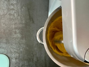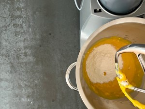 Efter det tillsätter jag hälften av mjölmixen och blandar samman. Tillsätter sedan resten av mjölet och arbetar degen på medelfart i 3-5min.