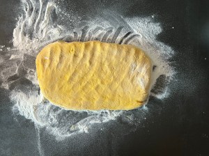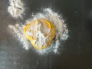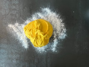 Jag mjölar bänken med rismjöl, ganska rikligt. Tar upp degen på mjölet, strör lite mer ovanpå och bollar den i mjölet. Jag kramar och knådar den inte, då den är lite för kladdig för det. Jämnar ut mjölet och lägger den mitt på, plattar sedan ut den med handen, genom att klappa på den. Känner så att den inte fastnar i bänken och för då den i mjölet för att den ska glida lättare. Nöjer mig när den är ca 45cm långt och 20cm bred.