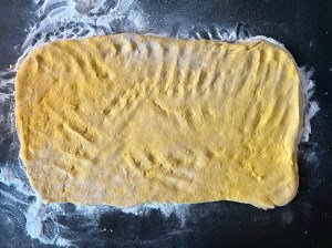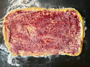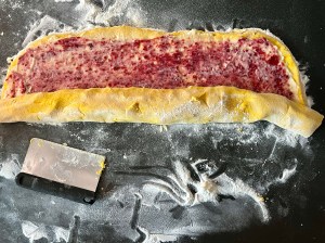 Sen rullar jag den, det är mycket fyllning och degen är ganska mjuk och skör. Var mjuk och bestämt och precis som i receptet till Kanelbullarnas Kanelbulle använd borste för att mjukt ta bort mycket mjöl och en mjölad degskrapa om den fastnat i bänken. Titta gärna på det här klippet, metoden är den samma.