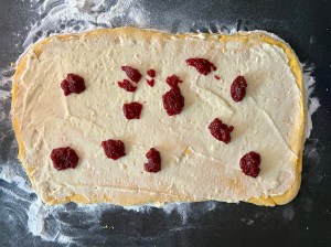 Först breder jag ut vaniljkrämen i ett jämnt lager. Toppar med hallonsylt och breder ut jämnt.
