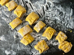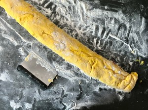 När degen är rullad, flytta den i mjölet och jämna till den så att den blir ca 60cm lång och jämntjock. Var mjuk och använd mjölade händer. Mät upp 5cm bitar och dela med en sytråd eller en tandtråd.