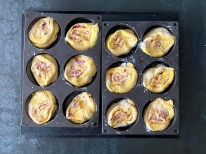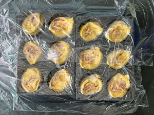 Lägg bullarna i formar, jag rekommenderar verkligen silikonformar, antingen de jag använder som finns hos bland annat Kitchentime, eller Tareq Taylors som jag sett hos bland annat Ica, eller ICAs variant på silikonformar. Några obetalda tips för enklare bakning. Pressa ned och ut dem i formen, plasta lätt och låt dem jäsa ca 60min.