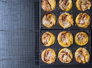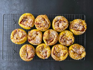 När de står i ugnen så kokar jag en sockerlag som jag sedan penslar bullarna med så fort de kommit ur ugnen. Sen lyfter jag upp dem på ett galler för att svalna.