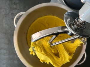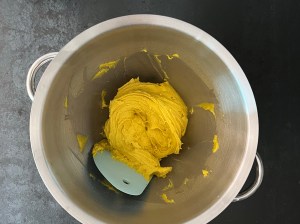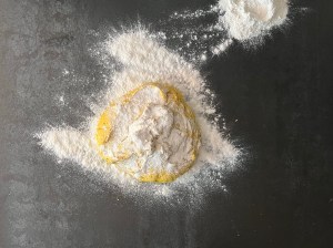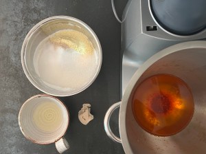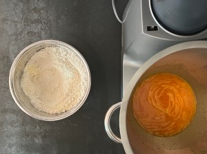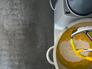 Jag sätter igång med väga upp vatten och vispa ut saffran i vattnet, sen fortsätter jag att väga upp alla torra ingredienser och blandar en mix av dem, vatten, jäst och olja. Löser upp jästen i saffransvattnet och tillsätter sedan oljan.