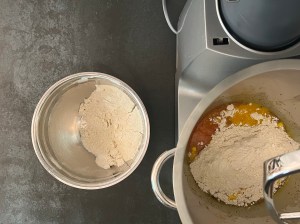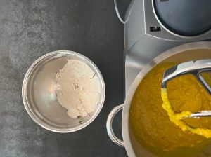 Efter det tillsätter jag hälften av mjölet och blandar samman i maskinen, med vingen. Tillsätter sedan resten av mjölet och blandar på halvfart i 3-4min. Stannar maskinen och skrapar samman degen, låter den vila i ca 10min i degbunken.