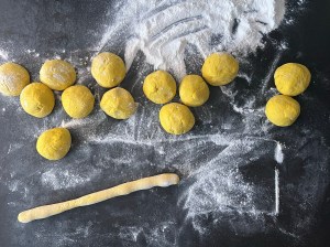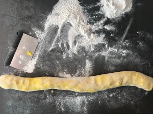 När degen vilat tar jag upp den på mjölad bänk, jag använder rismjöl när jag bakar ut mina. Pudrar degen med rismjöl och bollar den så att den inte kladdar. Kladdigt med glutenfritt så pressa inte händerna genom degen. Rullar den till en lång korv och delar i 14st bitar. Bitarna kontrollväger jag så att alla väger ca 60g.