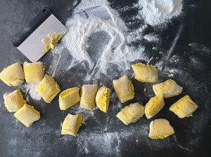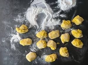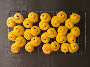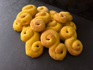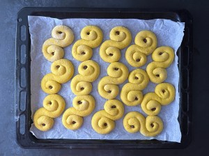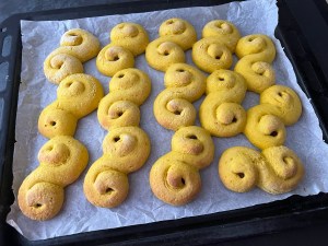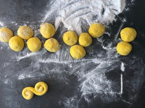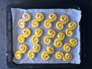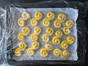 Med lätt mjölade händer rullar jag dem mjukt till släta bollar. Sen rullar jag ut varje boll till en jämntjock korv, ca 25cm lång. Korven formar jag till en klassik lussekatt genom att rulla in ändarna åt motsatt håll, lägger den sedan på en bakplåtspappersklädd plåt. Återupprepar med alla bollarna och plastar sedan plåten lätt så att lussekatterna kan jäsa.