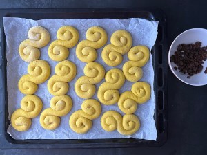 Medan de jäser blötlägger jag russin, ca 30st i kallt vatten. När de fått jäsa klart efter ca 60min så tar jag bort plasten, häller bort vattnet från russinen, sätter ner ett russin i varje snurra och bakar av dem i förvärmd ugn. Efter ugnen får de svalna på ett galler innan servering.